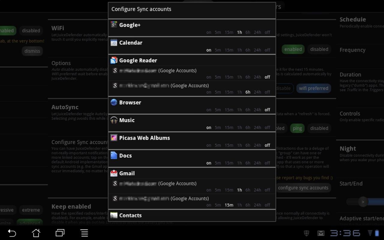 В настройках программы указывется какой из модулей должен автоматически отключаться. При этом настраивается уровень экономии энергии, а также периодичность фонового включения APN и Wi-Fi для проведения периодической синхронизации.
