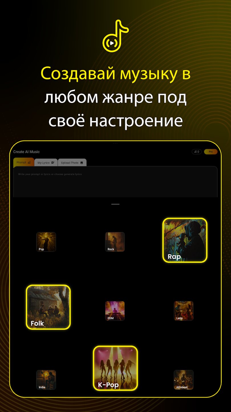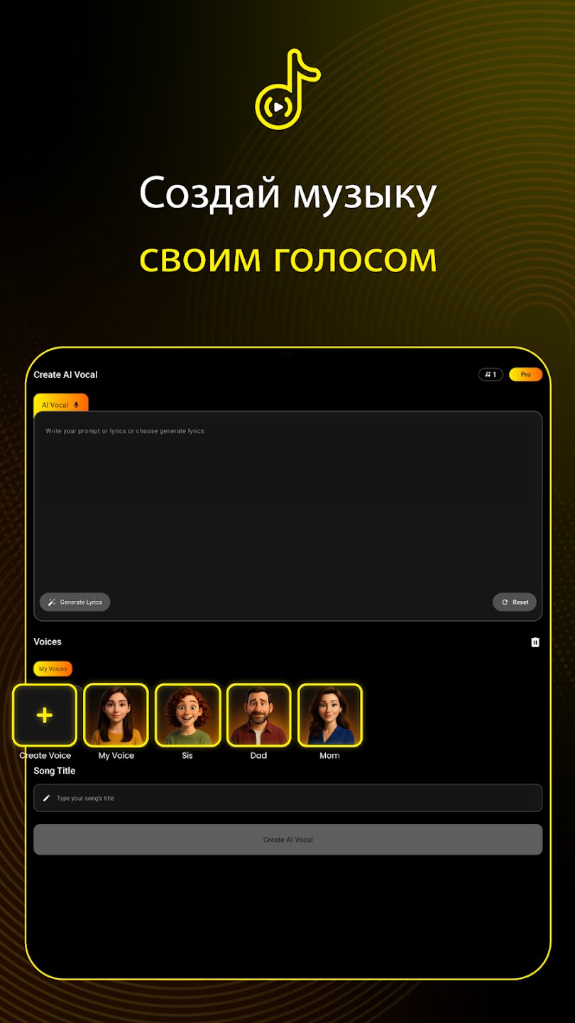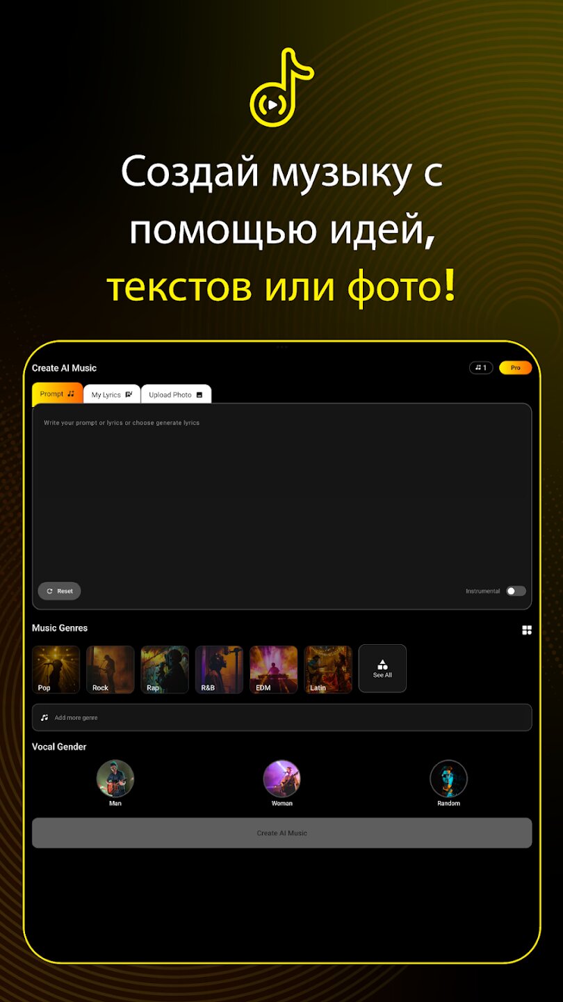 - Создавайте полноценные песни на основе простых подсказок или собственных текстов.