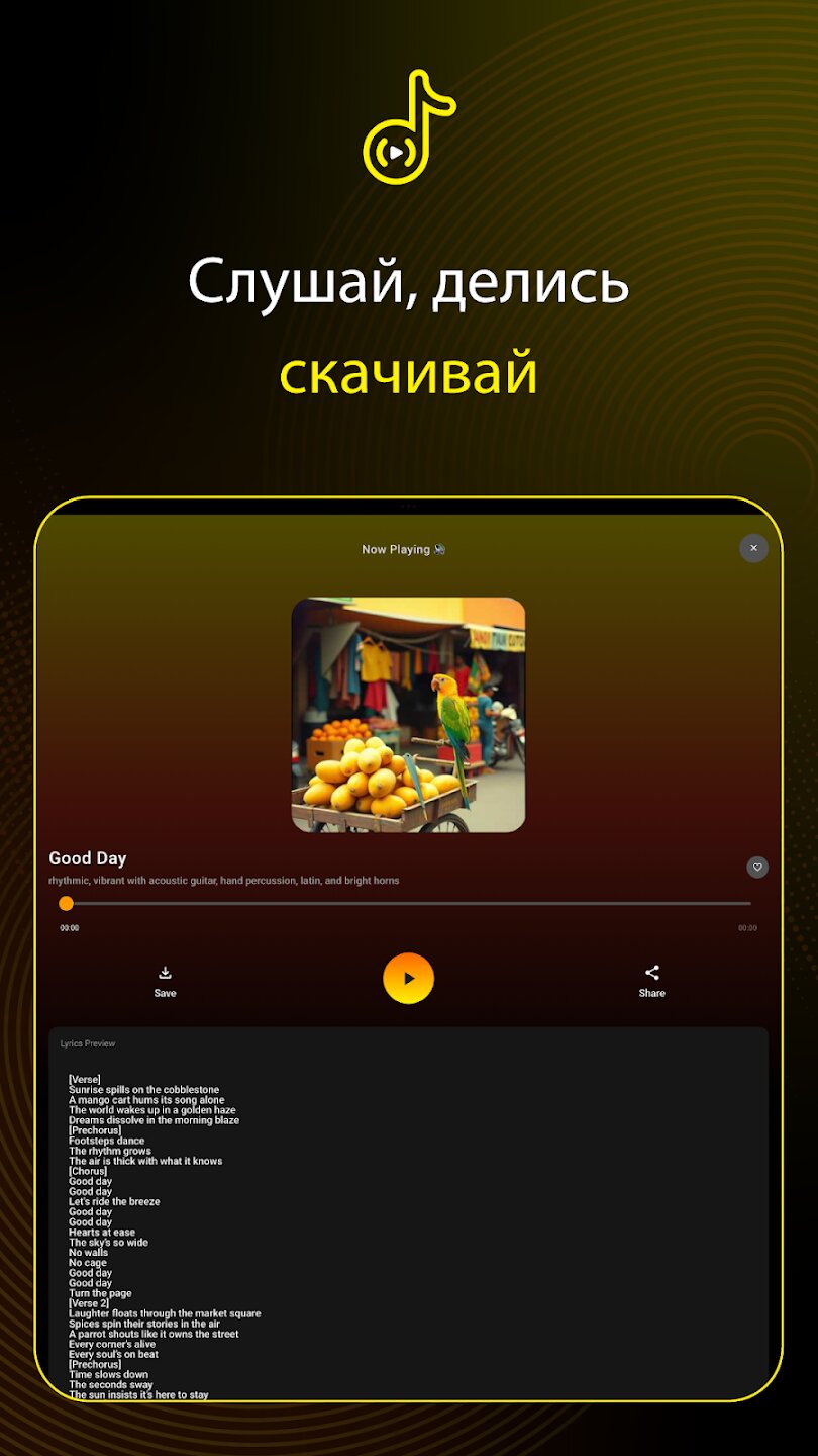 Вы можете легко экспериментировать с различными музыкальными стилями и дорабатывать творения искусственного интеллекта. Приложение позволяет редактировать и настраивать сгенерированные песни, пока они не будут полностью соответствовать вашему видению. Когда вы будете удовлетворены своим уникальным треком, вы сможете сохранить его прямо на своем устройстве и поделиться своим шедевром, созданным искусственным интеллектом, с друзьями и всем миром.