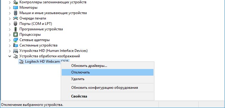 - нажимаем правой клавишей мыши на веб-камеру и в выпадающем пункте выбираем «Отключить».