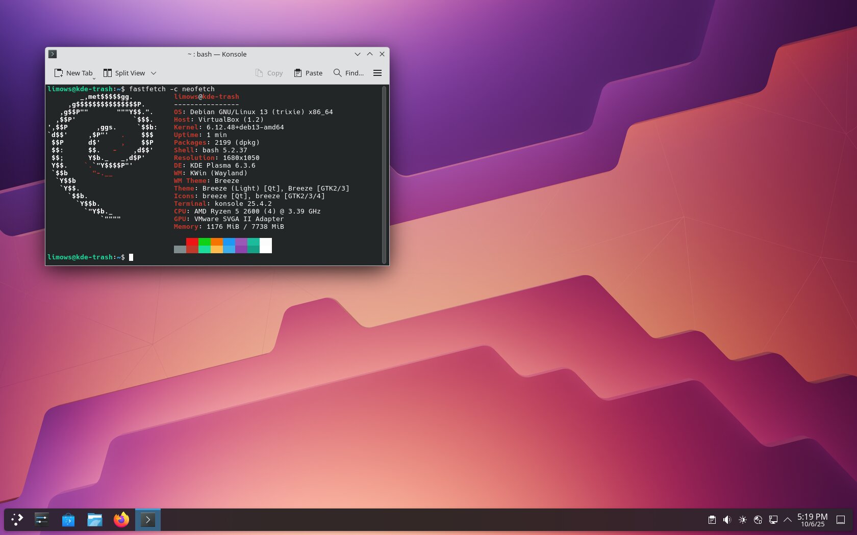 Я использовал базовый Debian trixie, но вы можете попробовать Kubuntu, AntiX, Deepin, Devuan, ElementaryOS… и многое другое, где есть менеджер пакетов apt и KDE. Владельцы дистрибутивов с rpm — поищите нужные пакеты в своих репозиториях. А те, кто выбрал Arch, Gentoo или что-то ещё более экзотическое — вы справитесь сами, верю в вас!