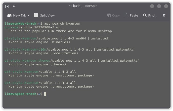 Введите в окне терминала команду apt search kvantum, чтобы найти нужный пакет. Перед вашими глазами должен оказаться следующий список.