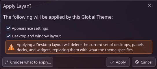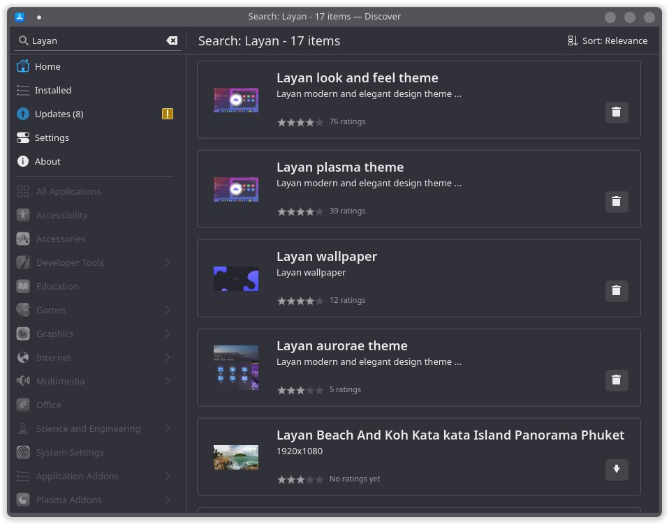Теперь откройте магазин приложений Discover и в строке поиска наберите название layan. Среди предложенных пакетов нас интересуют Layan… plasma theme, look and feel theme, aurorae theme, color schemes и при желании обои Layan wallpaper.