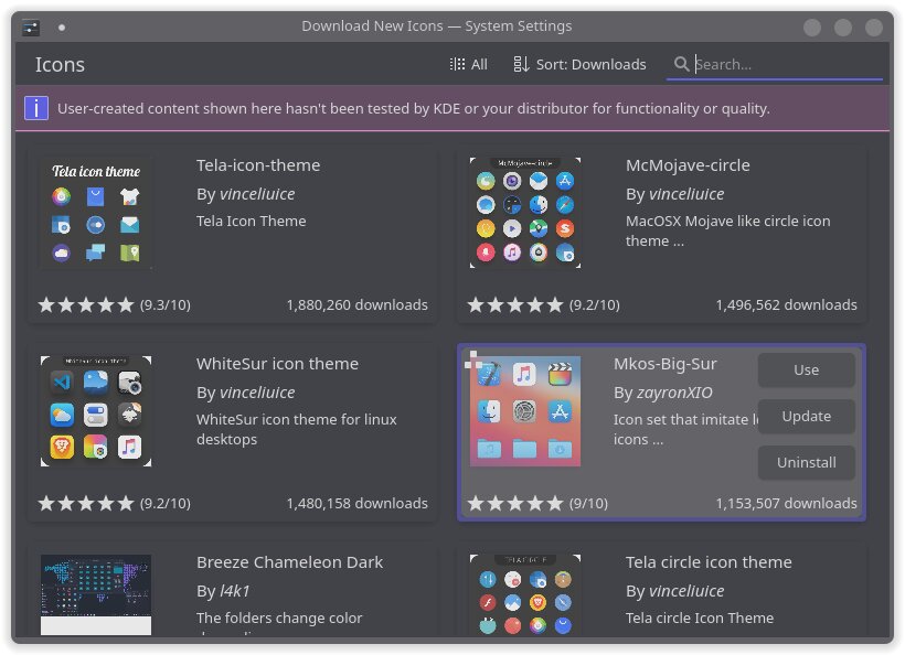 Многим по душе приходятся стандартные иконки Breese или Papirus, но я не большой их фанат. Раз уж мы решили создать что-то похожее на macOS, то я хочу предложить набор иконок Mkos-Big-Sur, который довольно просто добавить, вернувшись к конфигурации темы, выбрав раздел Icons («Иконки») и нажав на кнопку Get new («Получить новые»).