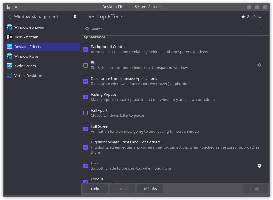 Пролистайте системные настройки почти до самого конца, остановившись на разделе Apps & Windows («Программы и окна») и выбрав в нём строку Window Managment («Управление окнами»). В открывшемся меню перейдите на вкладку Desktop Effects («Эффекты рабочего стола»).