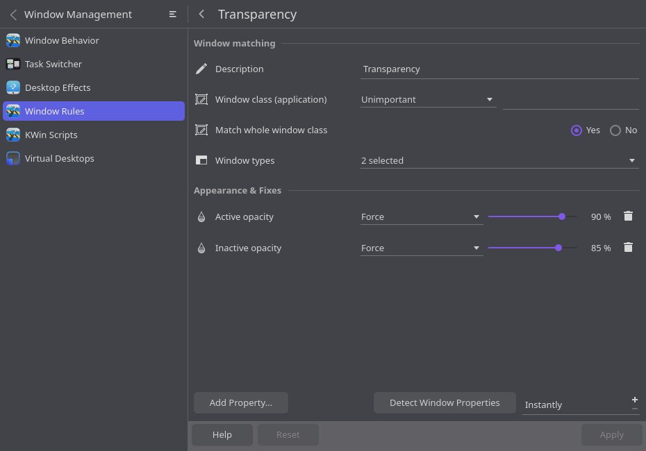 Мы на финишной прямой. Ещё несколько шагов, и прозрачными станут все окна. Самый простой вариант — добавить правила прозрачности всем окнам в активном и неактивном положении на вкладке Windows Rules («Правила окон») в пункте настроек оконного менеджера, который я вам уже показывал.