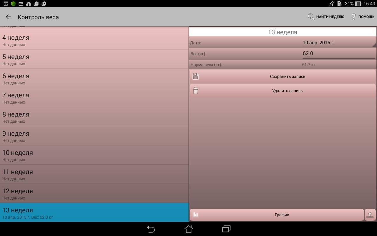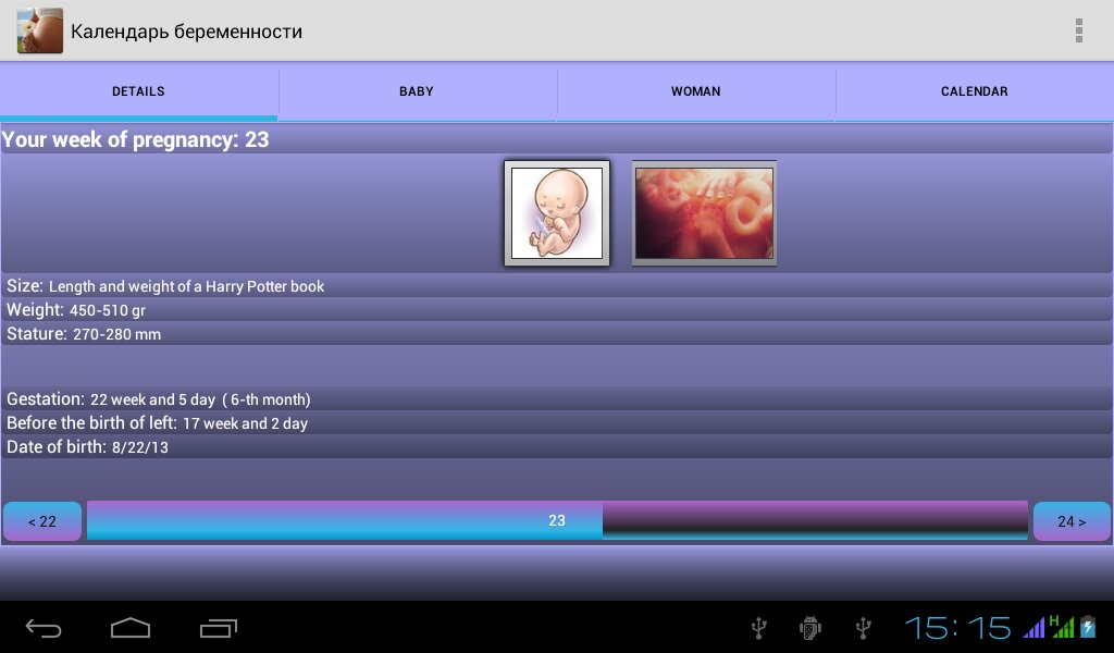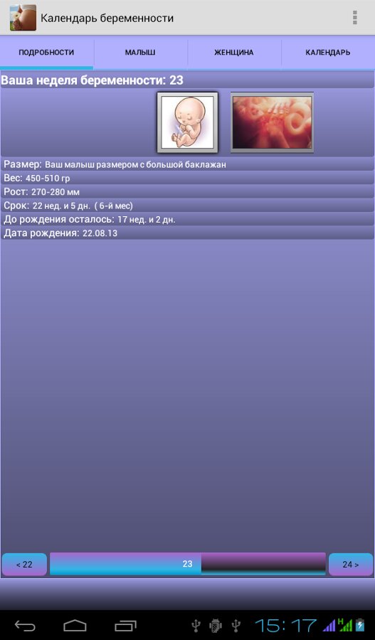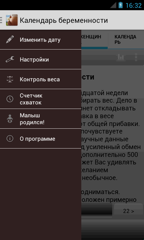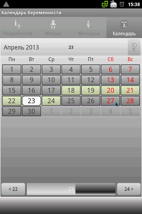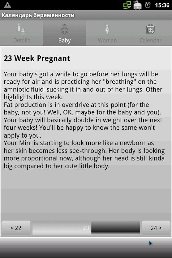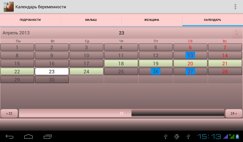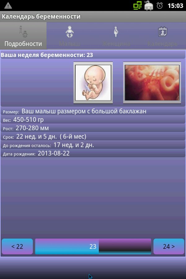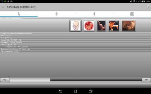Календарь беременности — приложение поможет вам узнать, как развивается Ваш малыш. Также описаны состояния будущей мамы, что с ней будет происходить и на что стоит обратить внимание. Информация выдается по неделям развития беременности.