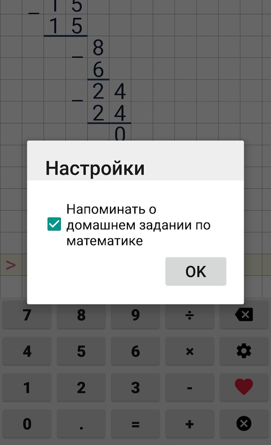 Наше приложение крайне удобно и полезно для школьников. В приложении калькулятор есть почти все необходимые для вычислений функции. Приложение поможет вам решить даже самые сложные задачи. Использовать этот калькулятор можно не только на математике, но и на геометрии физике и информатике. Очень крутая графика и оформление в этом калькуляторе. Приложение не занимает много места на телефоне и не тормозит процессор. Умножайте и делите в столбик, складывайте и вычитайте числа. Выполняйте домашнюю работу быстро и легко. Делите с остатком и без него. В приложении поддерживаются периодические и десятичные дроби. Вводите даже самые сложные примеры из учебника по математике, и калькулятор решит его за вас. Также вы можете поставить напоминалку, чтобы не забыть сделать домашнее задание. Приложение абсолютно бесплатное. Пользуйтесь им без доступа к интернету. Очень простое в управлении приложение, справится каждый.