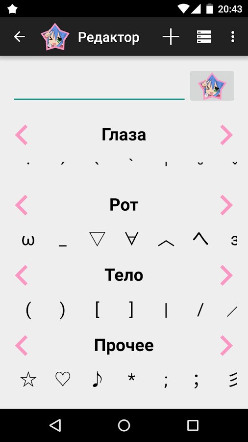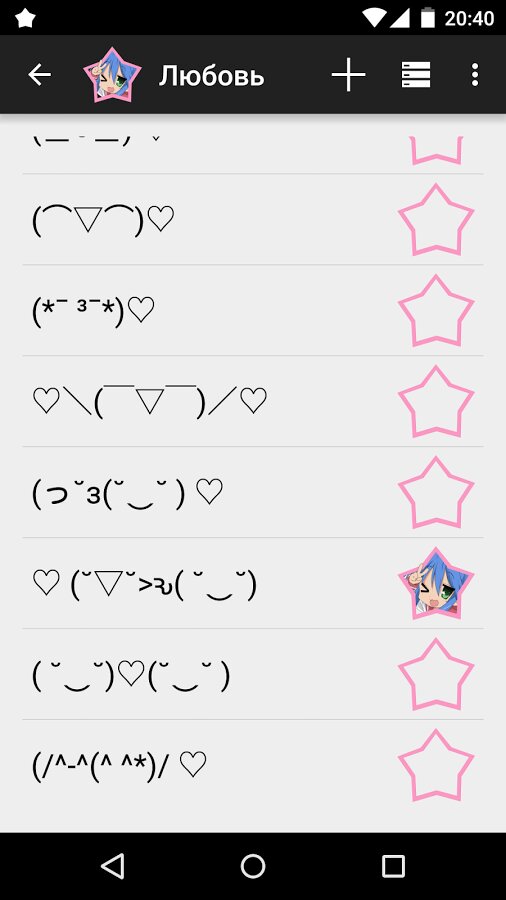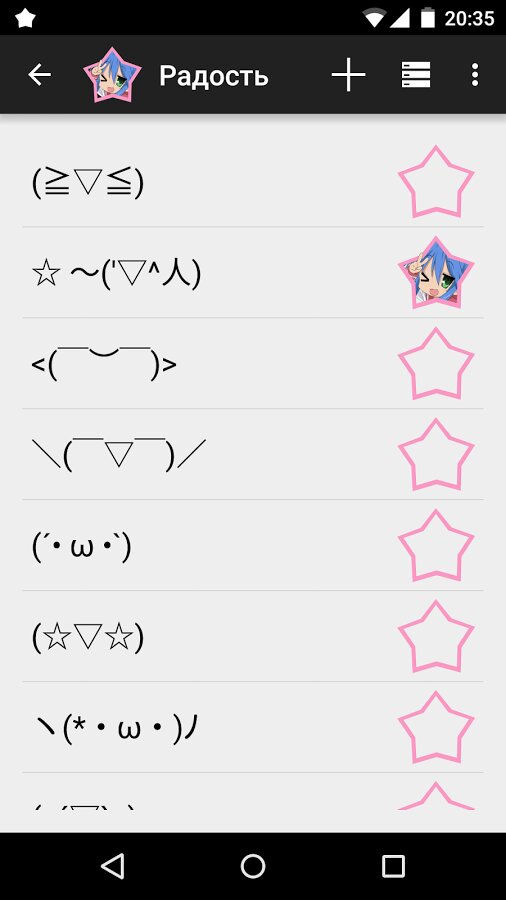 Каждый смайлик может быть добавлен в Хранилище (улучшенный аналог Избранного) как из Редактора (при помощи кнопки), так и непосредственно из подкатегорий (при помощи контекстного меню). Чтобы удалить смайлик из Хранилища, нажмите и удерживайте экран, после чего нажмите “Удалить”. Всё просто! (^_<) ~ ☆