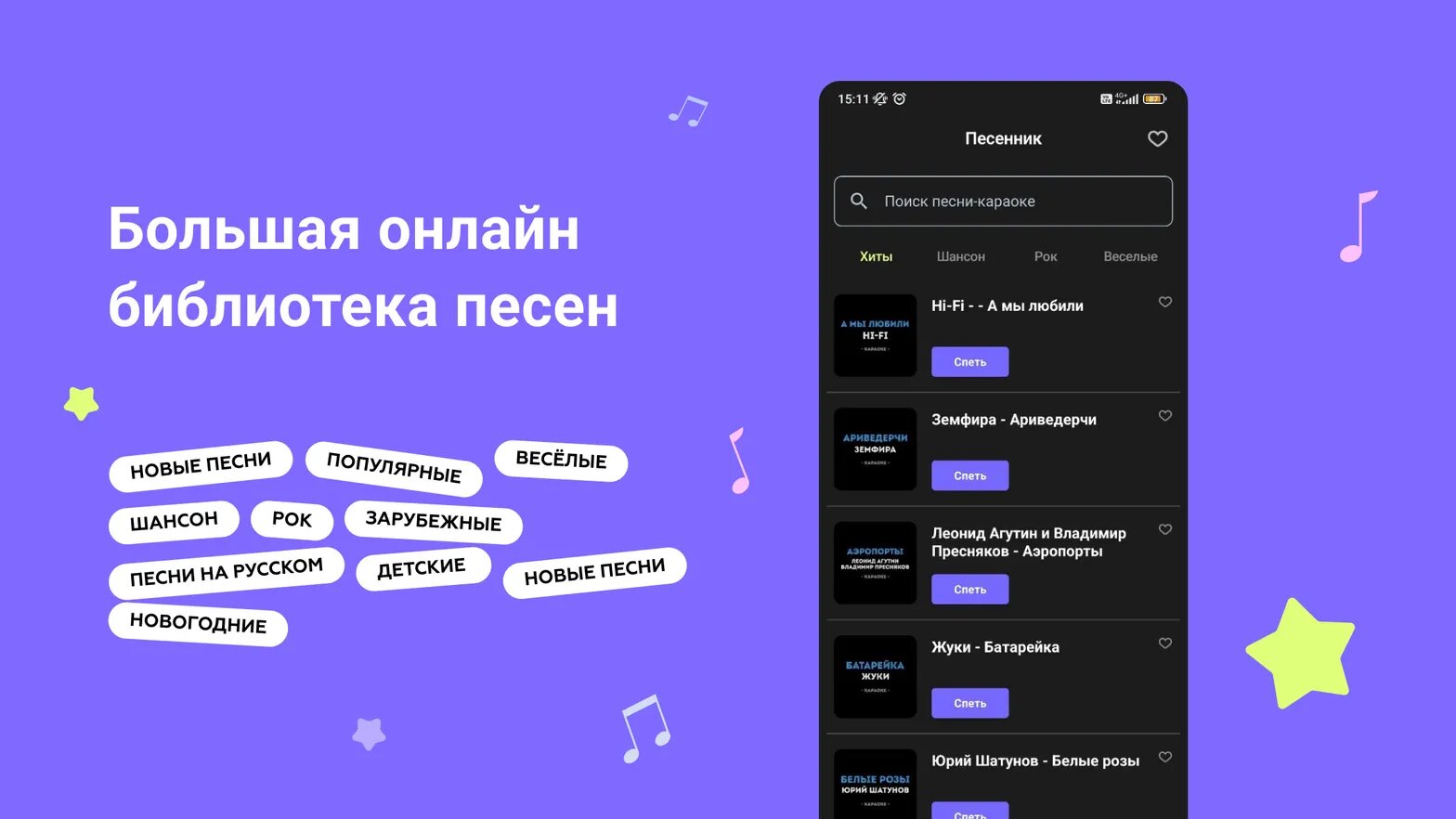 Караоке — каталог песен и конструктор — это универсальное мобильное приложение, которое превращает ваше устройство в персональный караоке-аппарат. Это бесплатное приложение сочетает в себе обширную онлайн-библиотеку песен с уникальной функцией конструктора песен, позволяя вам подпевать тысячам треков самых разных жанров. От поп-музыки и рока до детских песен и праздничных хитов — приложение предлагает обширный каталог, организованный по удобным для просмотра категориям, благодаря чему вы всегда найдете идеальную песню для любого настроения или случая.