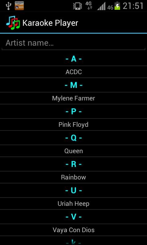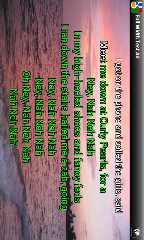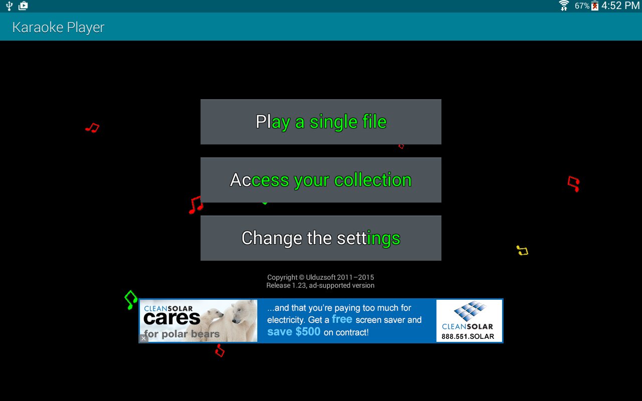 Простой караоке плеер для Андроид.Работает с форматом .kar и не только. Без рекламы. C версии 1.12 в бесплатной версии присутствует рекламный блок. Реклама отключается за $10.Можно убрать фоновые картинки, оставив однотонный фон. Размер и тип шрифта можно менять. Имеется пара эффектов исчезновения прочтённой строки.
