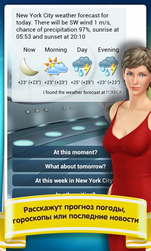 - Многое знает и умеет: отображение актуальной погоды и прогноз на несколько дней, свежие новости, ежедневные гороскопы, неиссякаемое количество анекдотов, напоминания о днях рождения (тел. книга + ВКонтакте + Facebook*)…