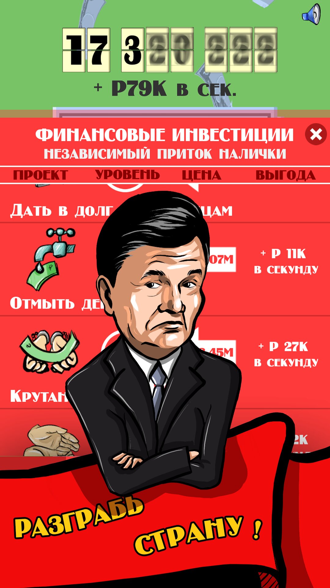Хочешь зарабатывать по миллиону рублей в день, не выходя из дому? Стань казнокрадом и деньги сами потекут к тебе в карман: инвестируй в бизнес и пройди путь от продавца на рынке до генсека КПСС.