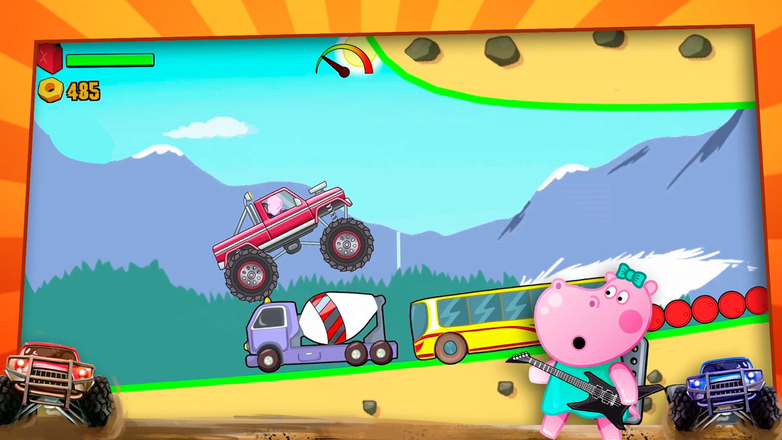 В игре множество увлекательных трасс, насыщенных разнообразными препятствиями, которые дети будут с удовольствием преодолевать. Взрывайте и крушите все на своем пути. Чем больше повреждений, тем больше очков Вы сможете заработать! Гиппо на своем автомобиле с легкостью сможет преодолеть любые препятствия. На таком внедорожнике не страшны никакие опасности и под силу любые экстремальные трассы. Monster Truck (Монстр Трак) — детские гонки с красочной графикой и реалистичной физикой!