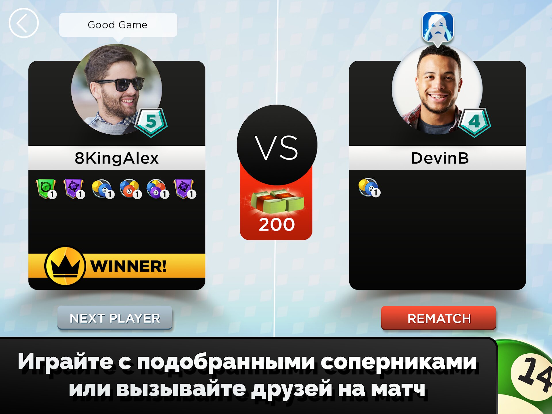 Суть игрового опыта — захватывающие соревновательные игры. Вы можете бросить вызов лучшим игрокам в восьмерку со всего мира в онлайн-матчах, поднимаясь в рейтинге, чтобы разблокировать столы с высокими ставками. Игра имеет комплексную систему прогресса, в которой вы зарабатываете деньги и награды за победы. Вы также можете создавать клубы с друзьями или присоединяться к ним, чтобы участвовать в специальных мероприятиях, вместе подниматься в рейтингах и стремиться стать абсолютным чемпионом, известным всем в сообществе Kings of Pool.