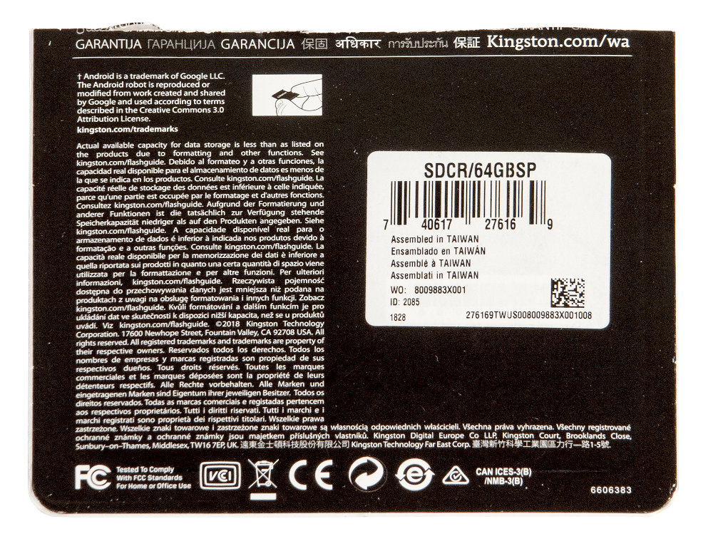 Карта памяти поставляется в блистере черного цвета, а надписи на ней выполнены белым и серебристым цветом. На оборотной стороне упаковки имеется краткое описание, а также указана страна-производитель, серийный номер и объем данной карты памяти.