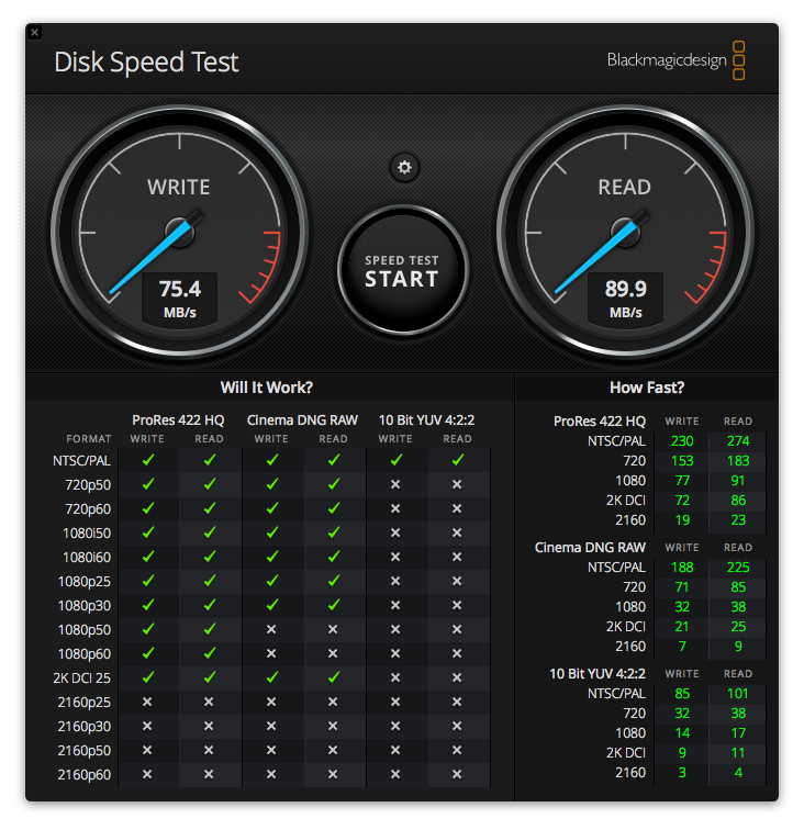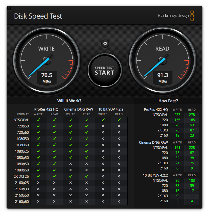 Австрийский производитель электронного оборудования для вещания и видеопроизводства Blackmagic Design, бесплатно предоставляет всем пользователям Mac OS очень удобную утилиту для тестирования карт памяти и накопителей. Для тестирования был использован ноутбук Mac Air 13 с интерфейсом USB 3.0, к которому и подключался карт-ридер Kingston FCR-HS4.