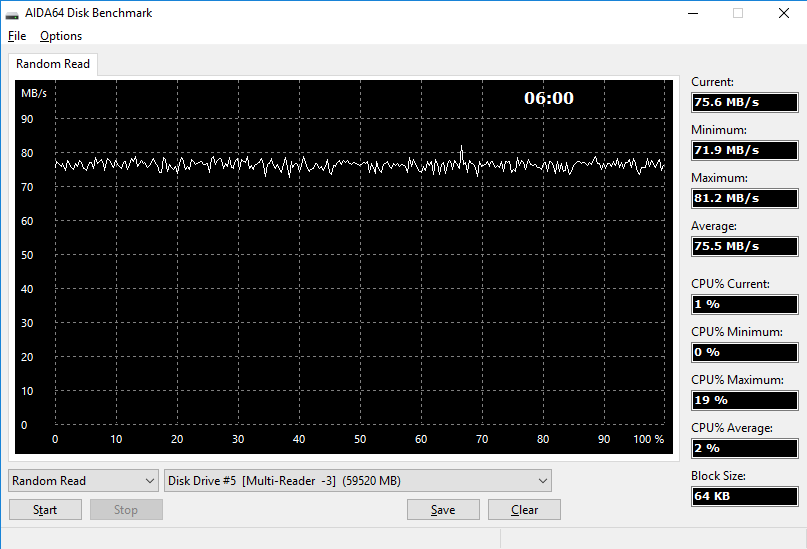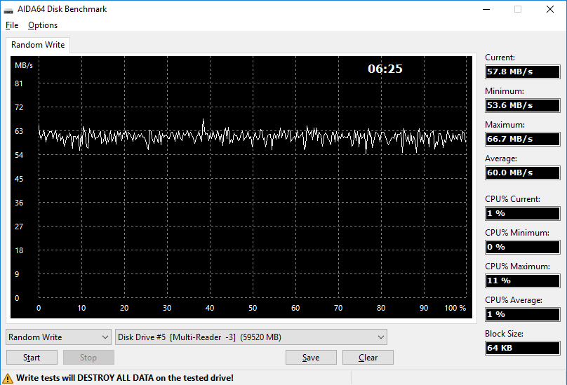 В качестве внешнего карт-ридера для подключения к ПК использовался Kingston FCR-HS4, который входит в список рекомендованных производителем. Он был подключен к порту USB 3.0, реализованный на базе контроллера, интегрированного в чипсет Intel Z87. Перед началом тестирования карта памяти была отформатирована под файловую систему exFAT, с которой она и поставляется изначально. Для тестов карт памяти были использованы три достаточно популярные утилиты, такие как: Blackmagic Disk Speed Test, CrystalDiskMark, встроенный бенчмарк в AIDA64 и имитация обычного копирования в Windows.