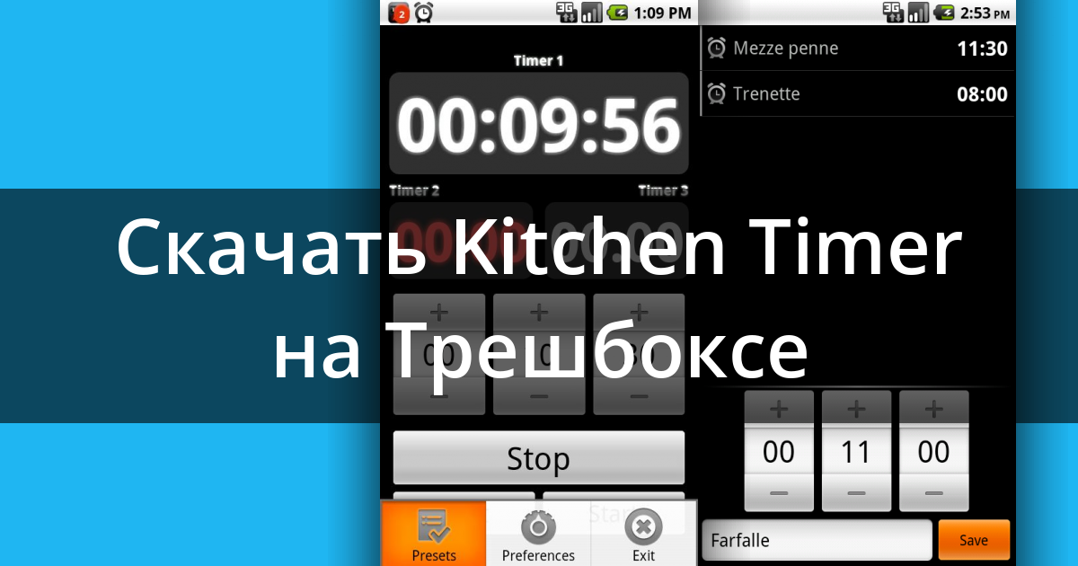 Kitchen Timer — Простенький кухонный таймер с поддержкой нескольких таймеров одновременно — помощь хозяюшке Поддерживаются WVGA, HVGA, QVGA экраны.