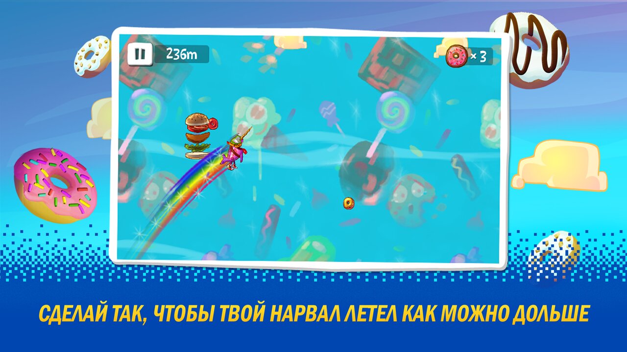 - Чем больше пончиков ты соберёшь, тем дольше будет летать твой нарвал!
