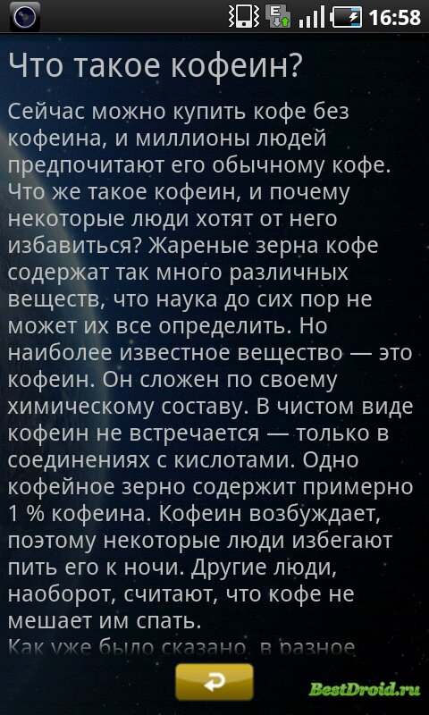 Нажимая на кнопку «Узнать!», программа загрузит из интернета статью на случайно выбранную тему, от ботаники до астрономии. Вы сможете блеснуть перед друзьями научными знаниями, а также пополнить свой запас эрудизма!