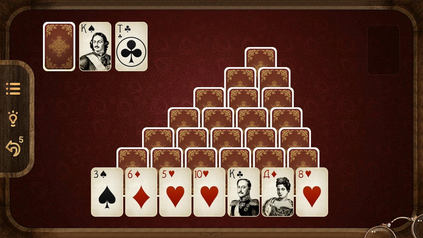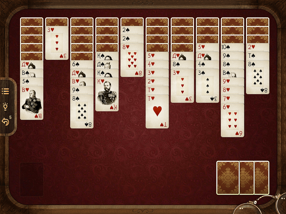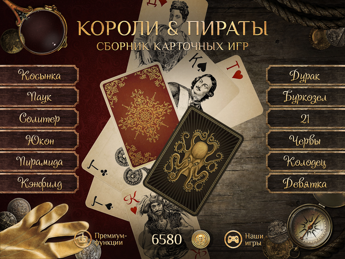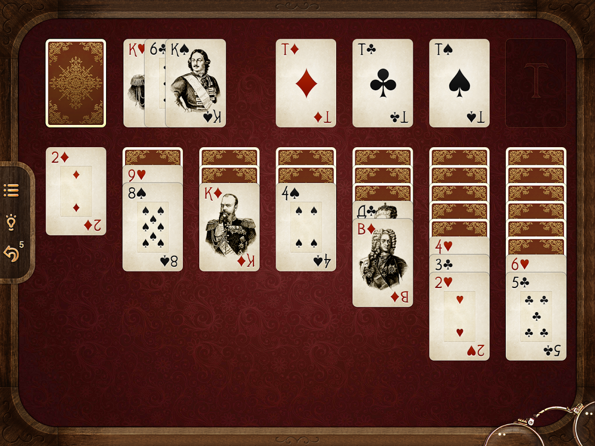 → Половину игр составляют пасьянсы, выдержанные в духе Российской империи XVIII-XIX веков. На карты нанесены портреты императоров и императриц, а также фельдмаршалов. Вторую половину составляют карточные игры — в популярной «морской» тематике. На картах — портреты пиратов, выполненные в авторском жанре.