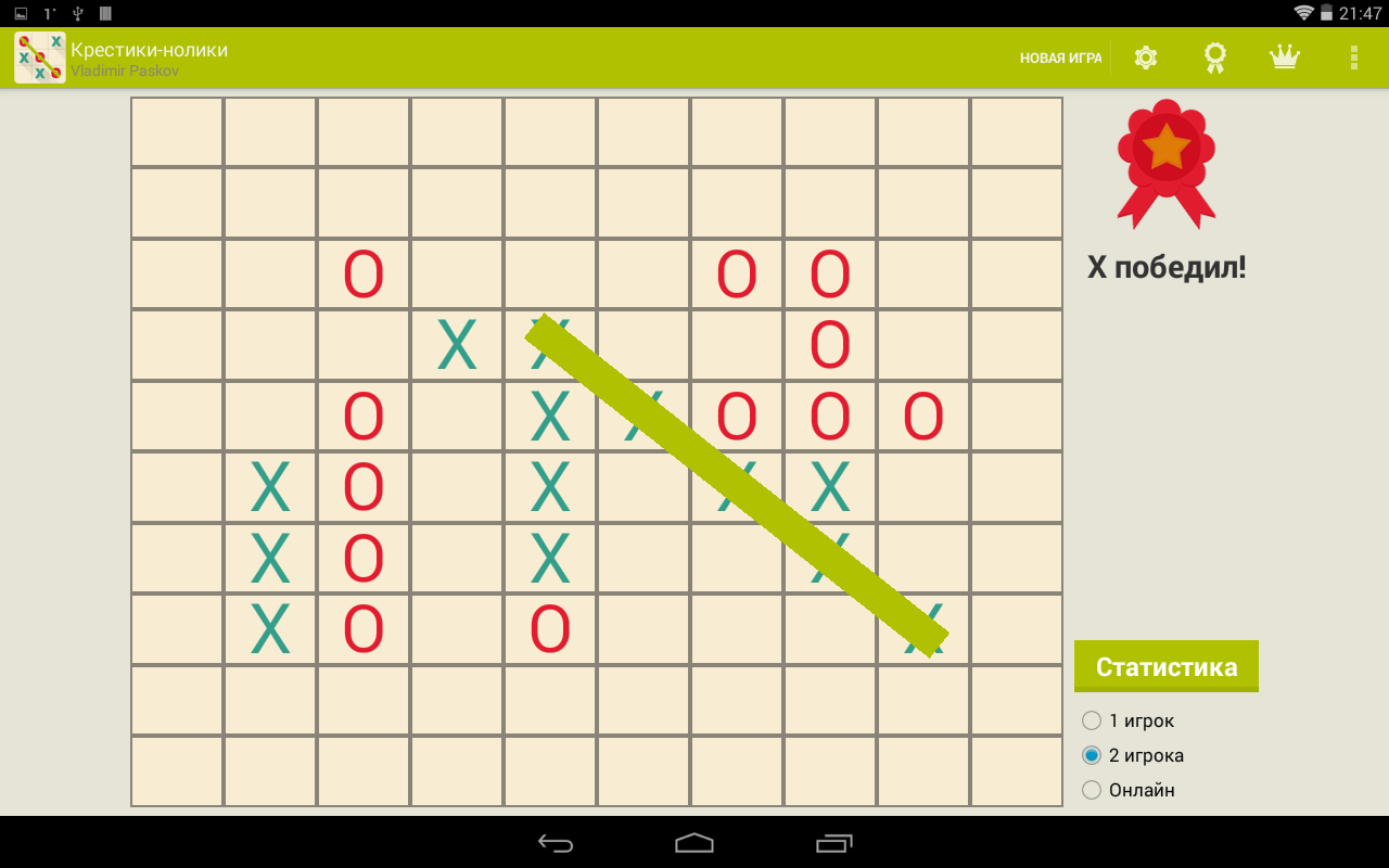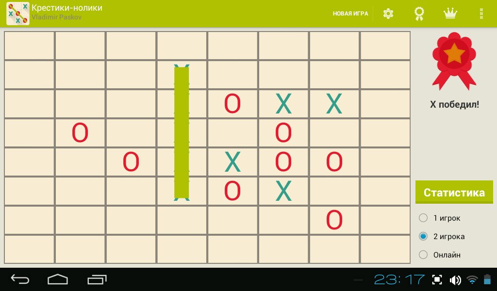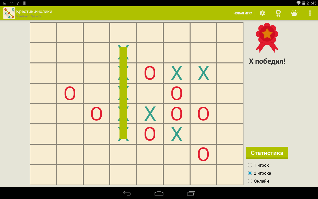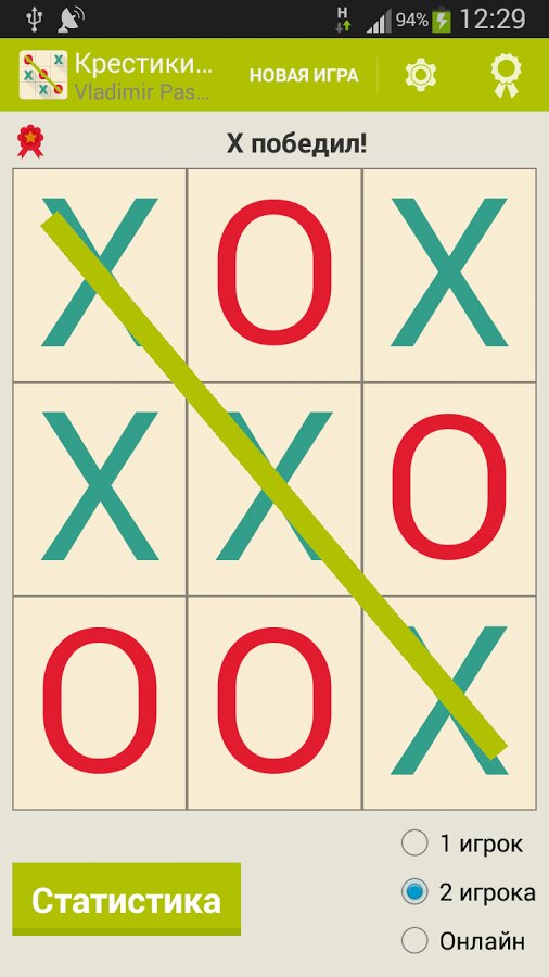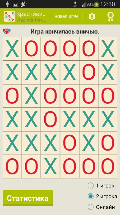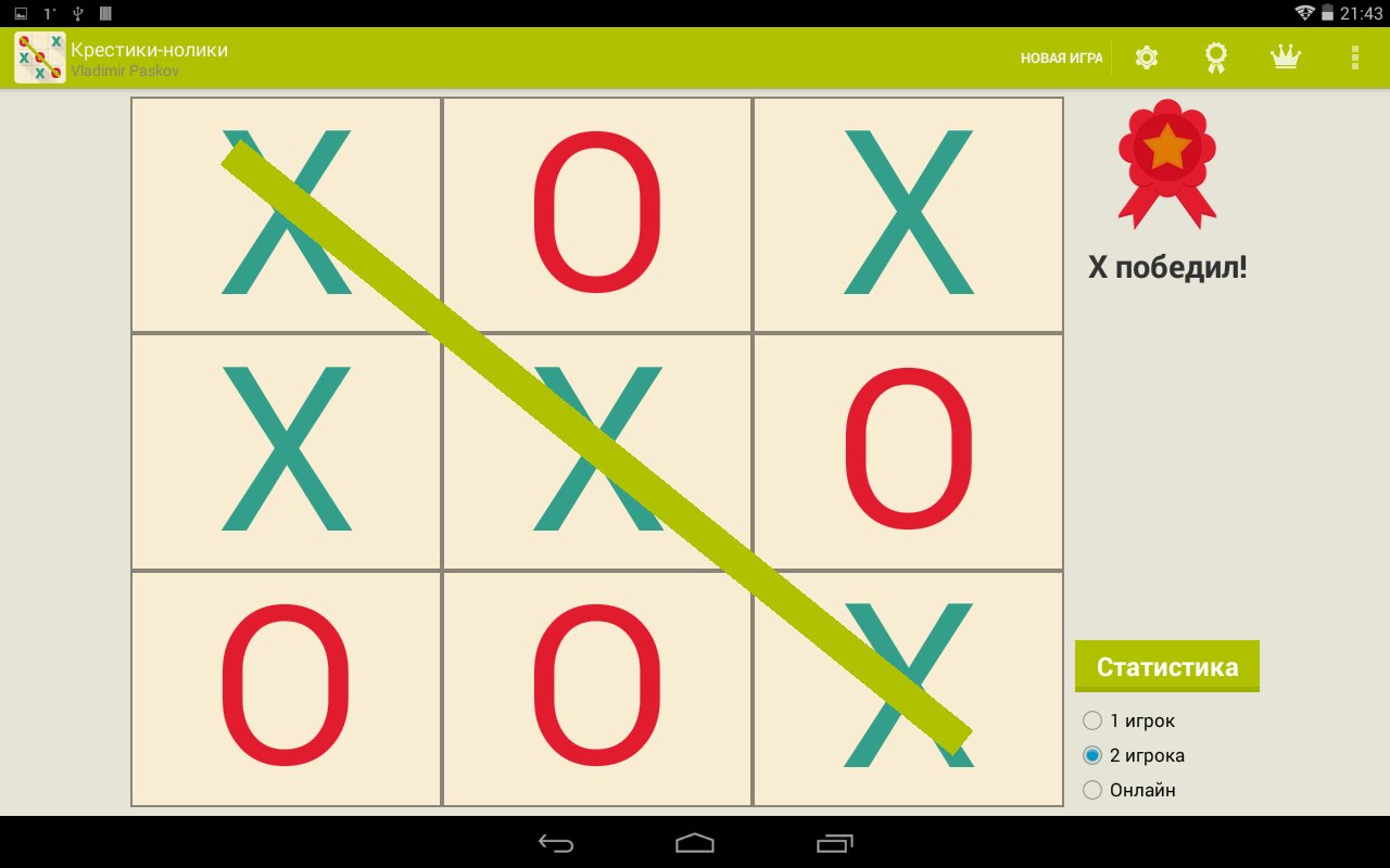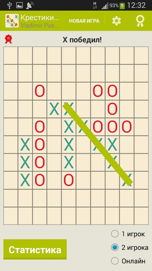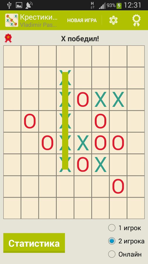 Неплохие Крестики-Нолики. Есть возможность играть с «искусственным интеллектом или другим человеком.