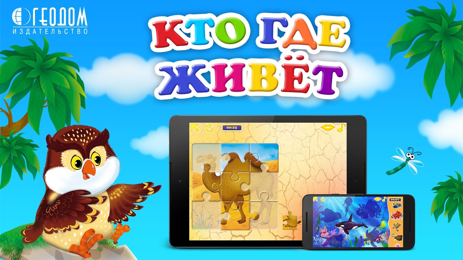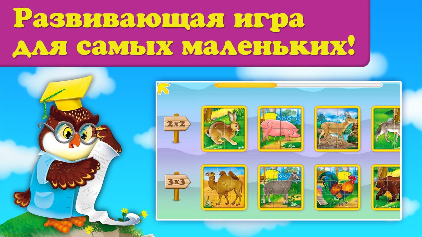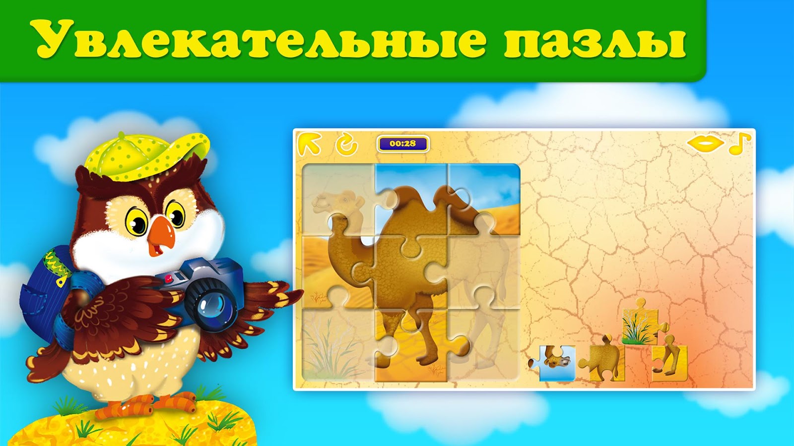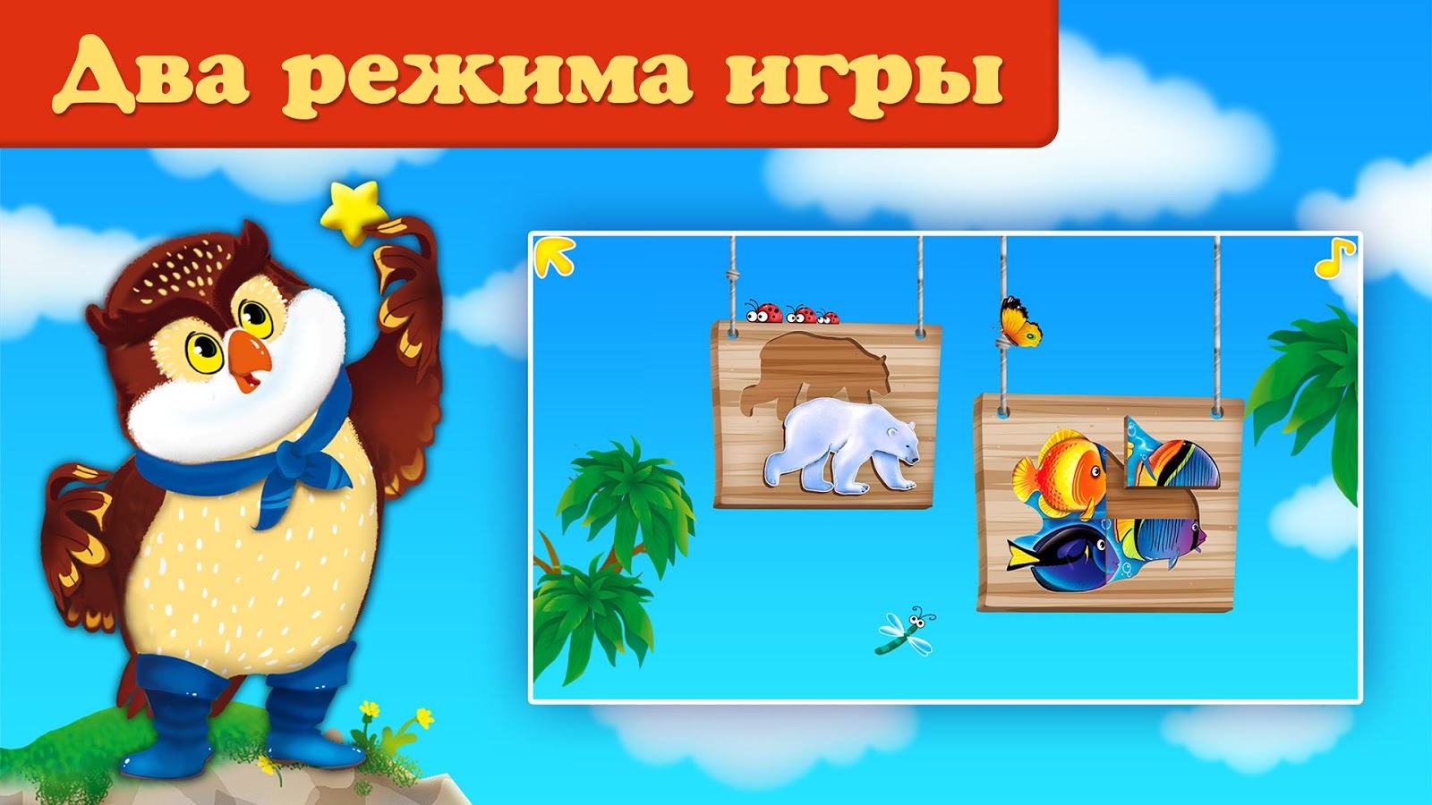 Каждый уровень сопровождается веселой мелодией, а при правильном расположении животного произносится его название, таким образом ребенок развивает визуальную память, внимание и речь. При успешном прохождении уровня звучат аплодисменты и на экране появляются разноцветные шарики, облачка, лопая которые, малыш получает поощрение от Совушки.