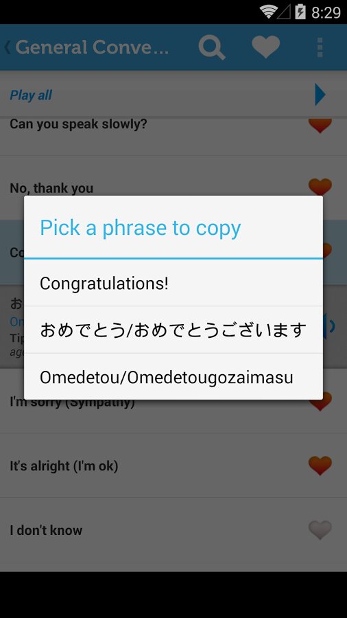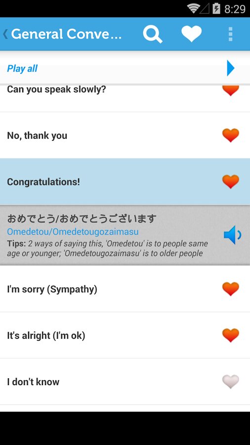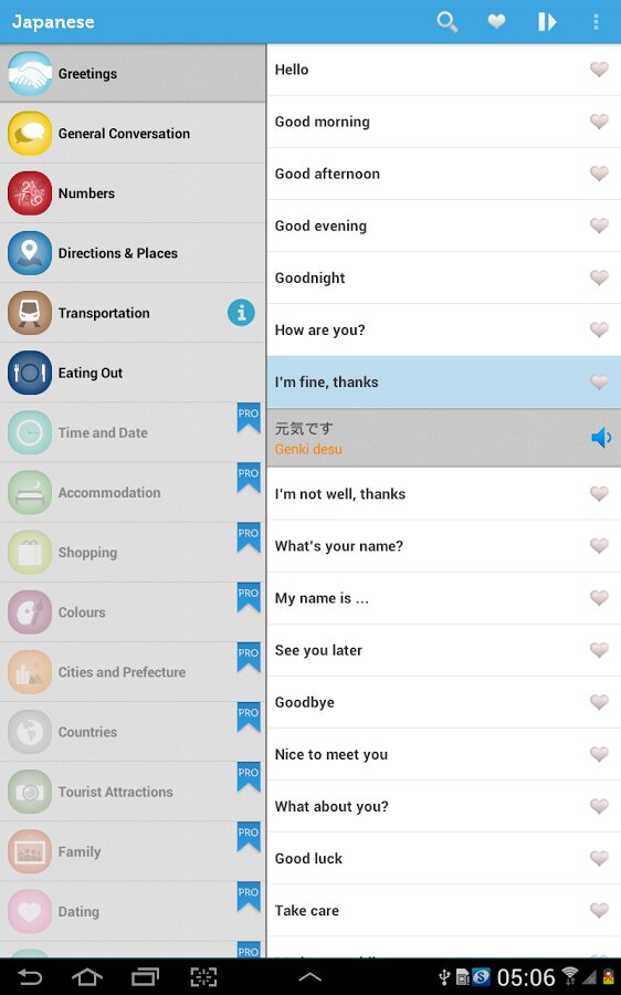 Изучайте японский с помощью разговорника, включающего 700 фраз, разбитых на 13 категорий. Learn Japanese Pro Phrasebook представляет собой простой в использовании мобильный японский разговорник, необходимый гостям Японии и тем, кто заинтересован в изучении японского. Произношение фраз записано с помощью носителей языка, и мы постарались совместить оригинальность произношения с доступностью понимания.