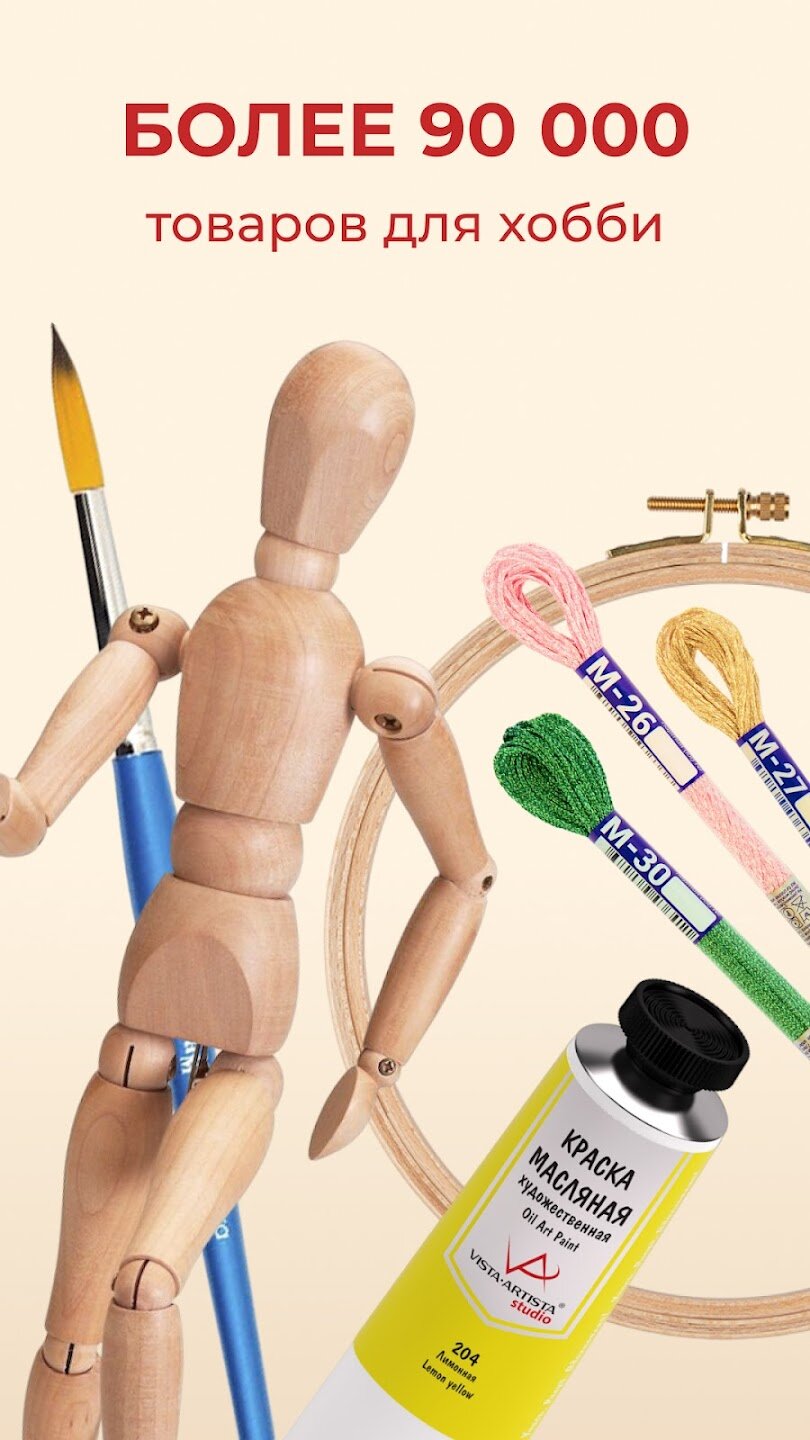 В приложении вы найдёте более 90 000 различных товаров для декора, рукоделия, творчества и приятного досуга. Есть инструменты и материалы для живописи, шитья, вышивания, вязания, моделизма и чеканки, декупажа и скрапбукинга, и ещё для множества разных видов хендмейда.