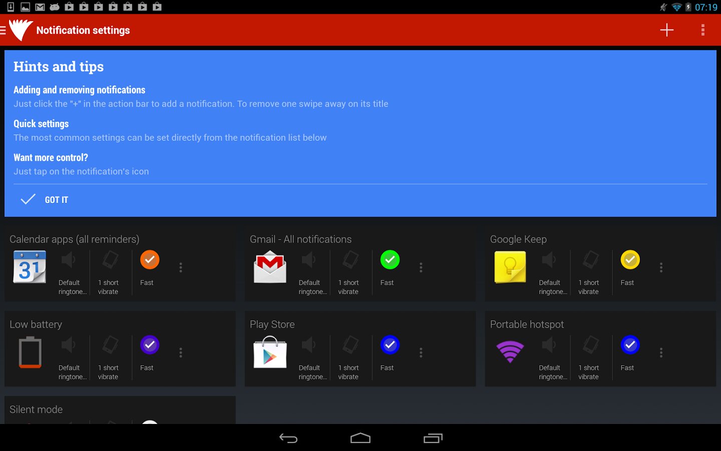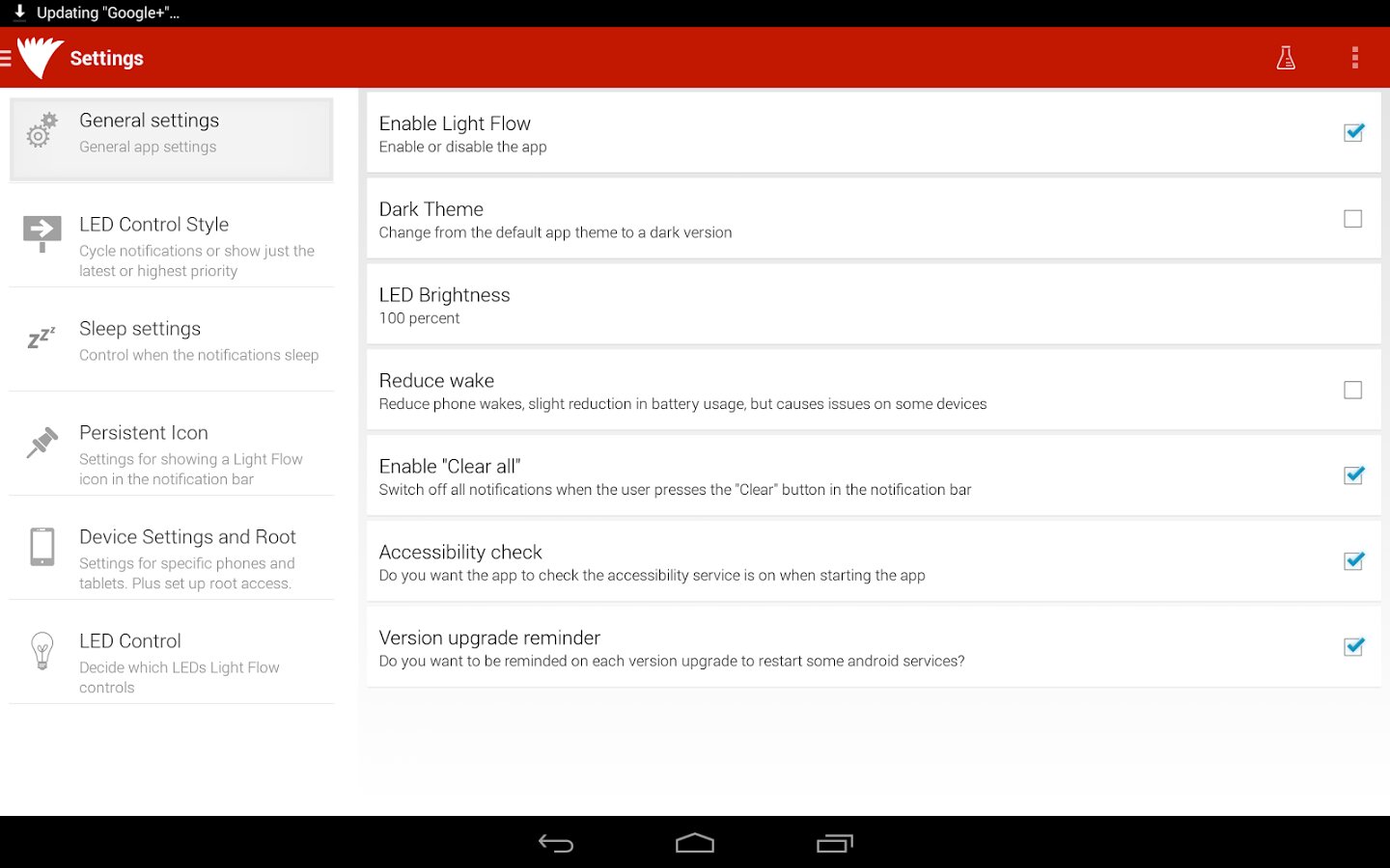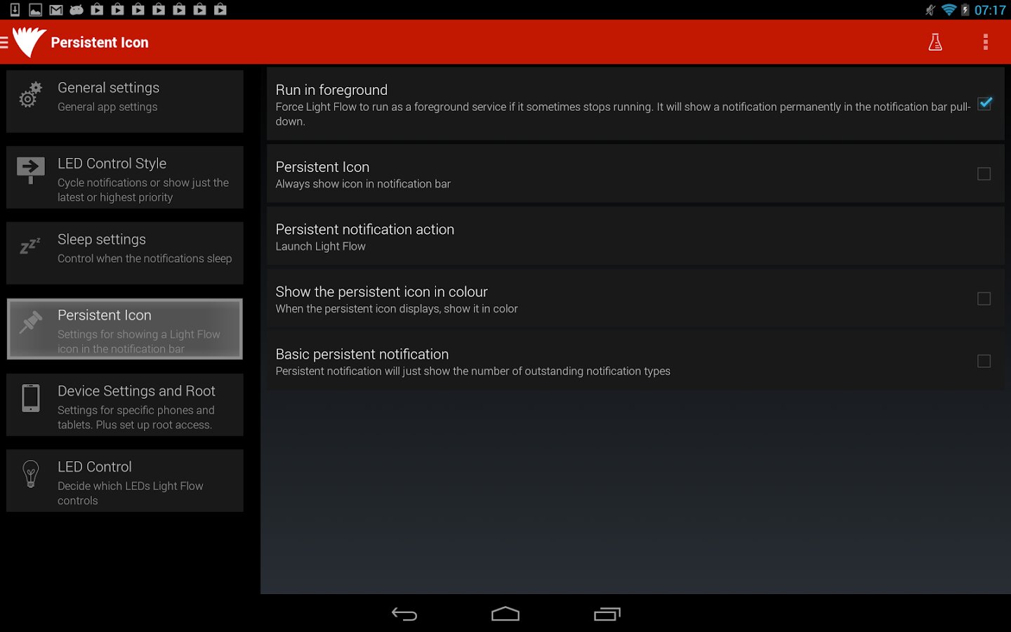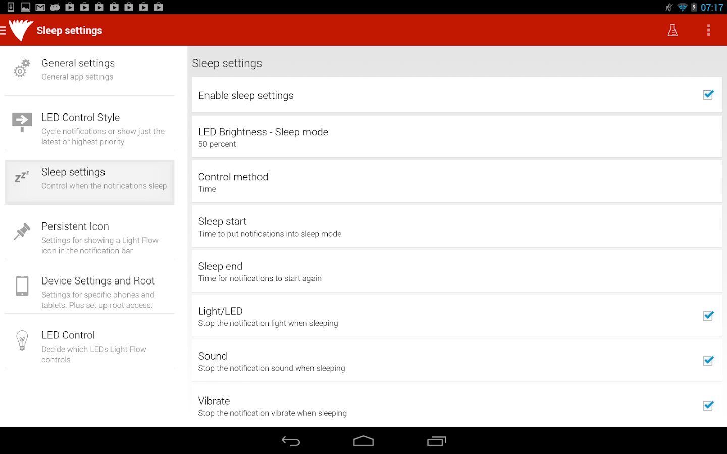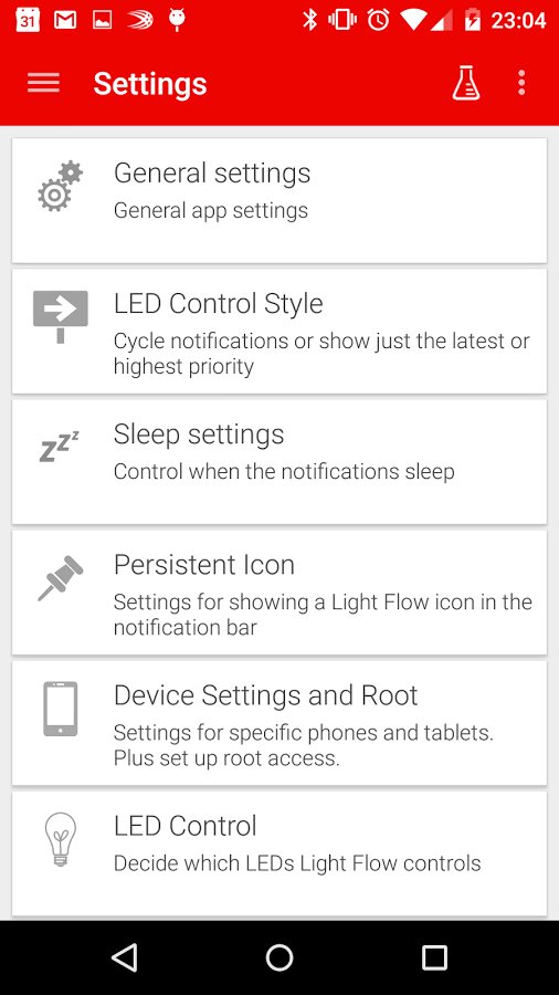 Light Flow — приложение для управления LED-индикатором, выставления последовательности цветовых уведомлений и их цвета. Есть возможность установки повторяющихся звуков или шаблонов вибрации в зависимости от типа уведомлений. Возможна установка «времени сна» и «заряда АКБ», и тогда индикация светом и вибрацией будет отключена.