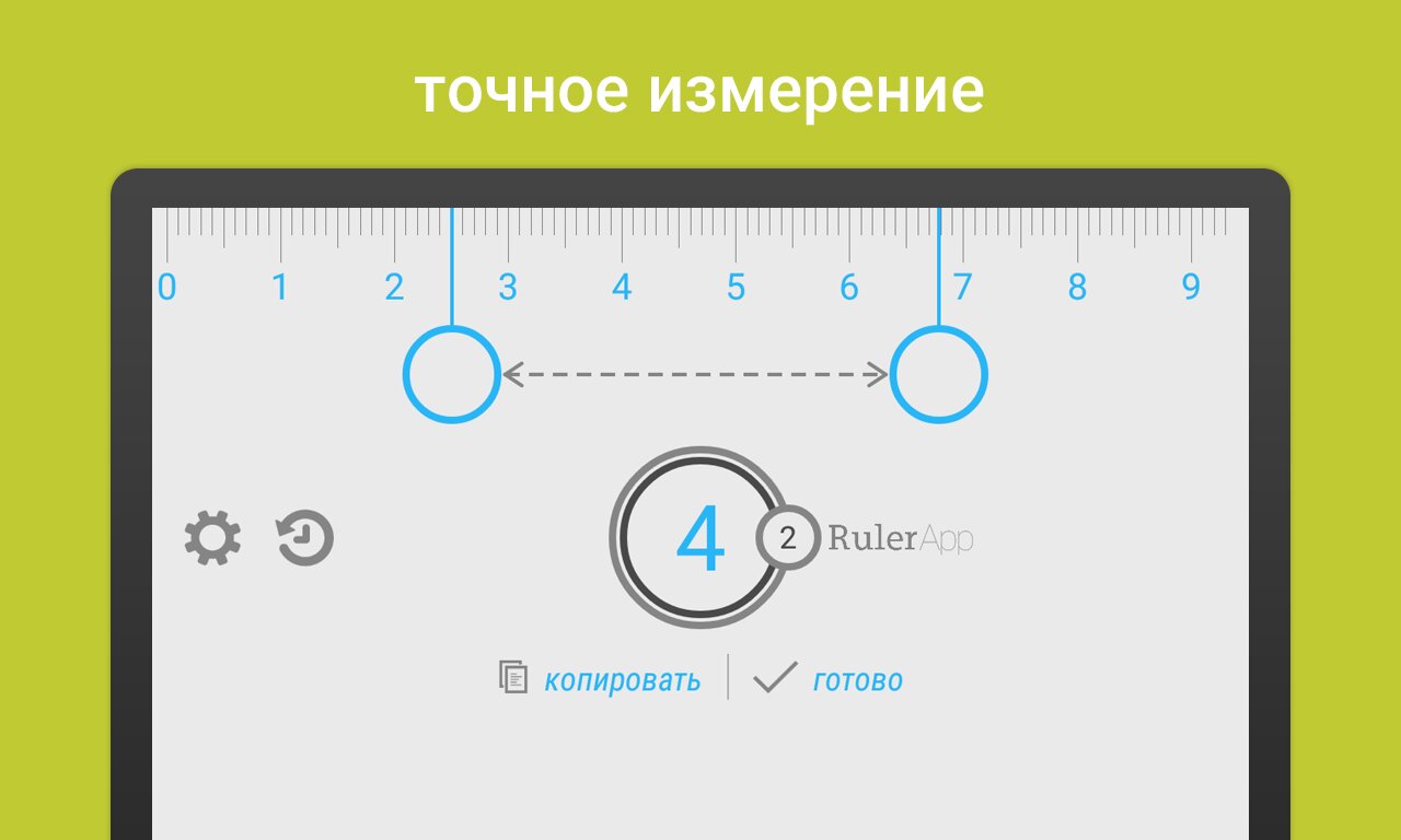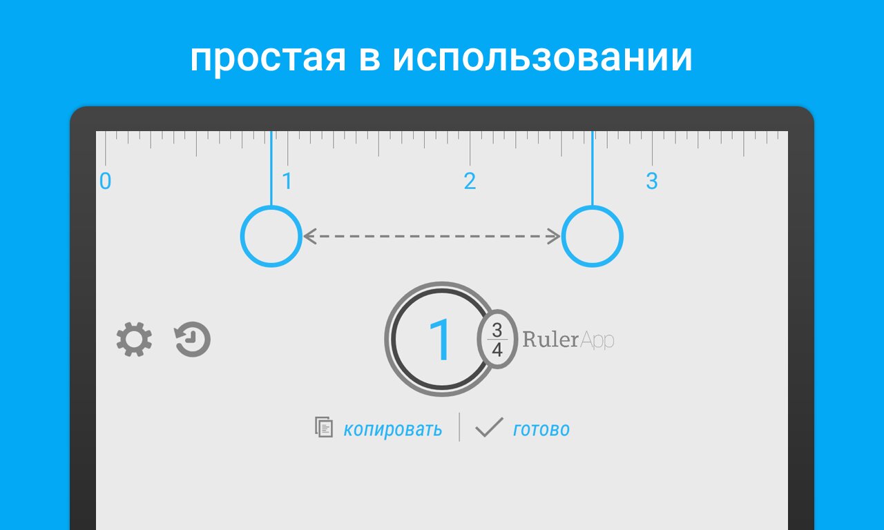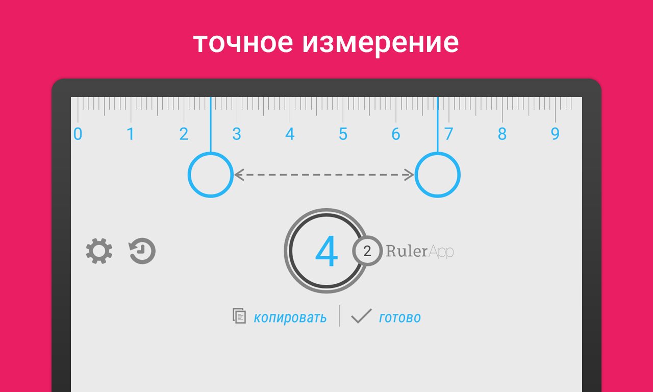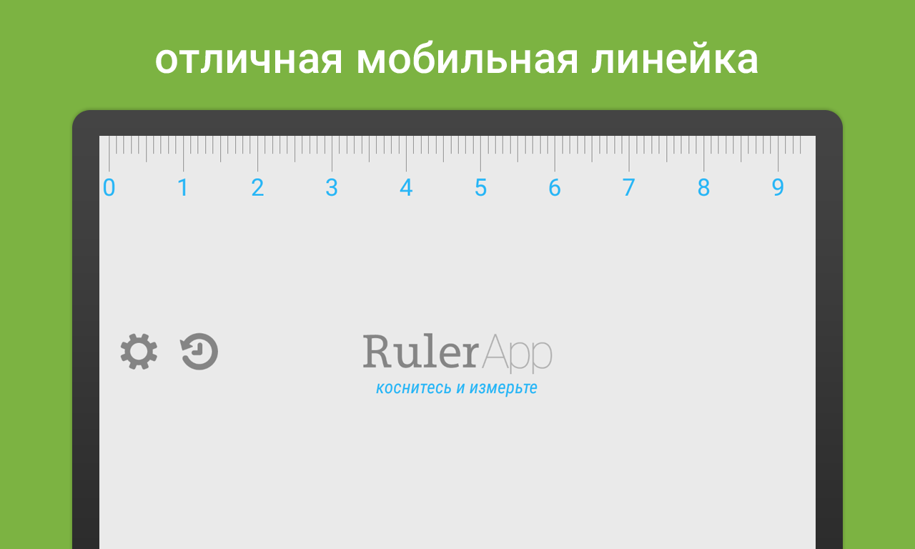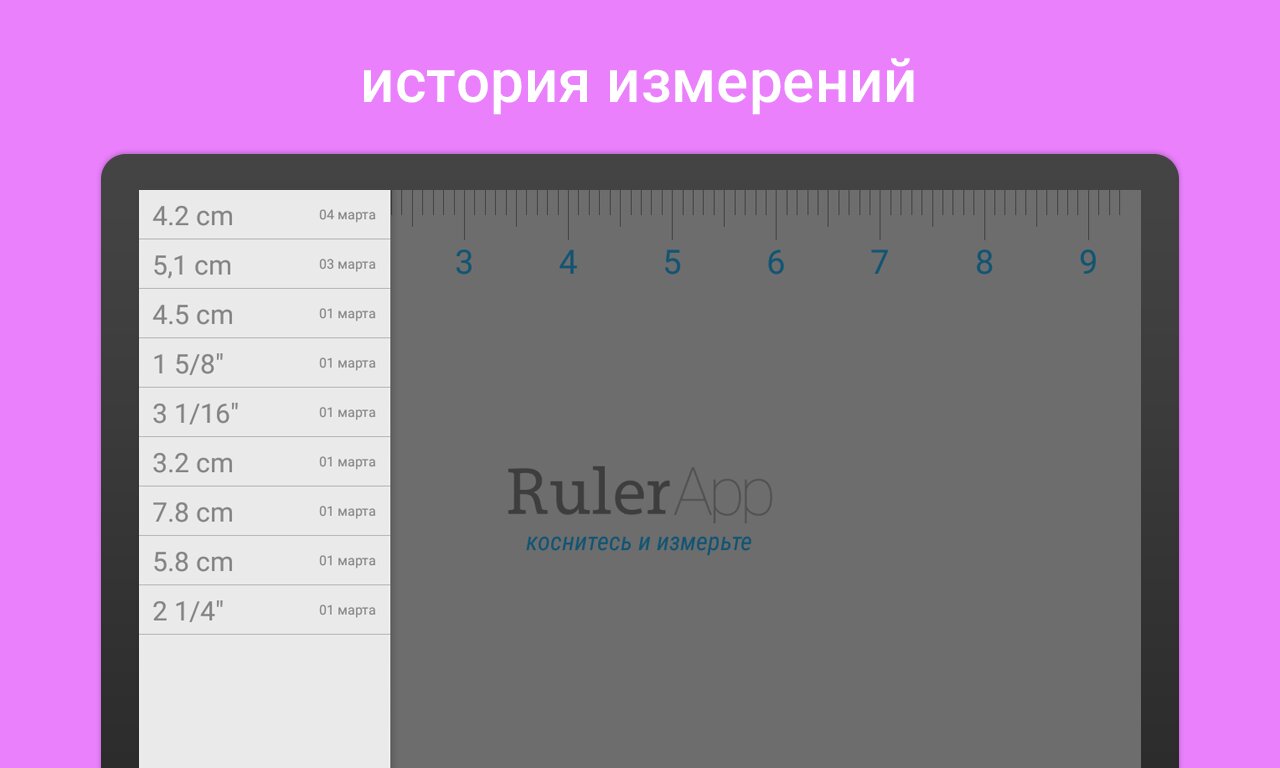 Линейка – измеряйте все, что вам нужно, с помощью нашей экранной линейки. Единицы измерения: дюймы и сантиметры. Нажмите на экран, чтобы воспользоваться лучшим на сегодня измерительным прибором с применением технологии «мультитач». Узнайте размер любого из окружающих вас предметов.
