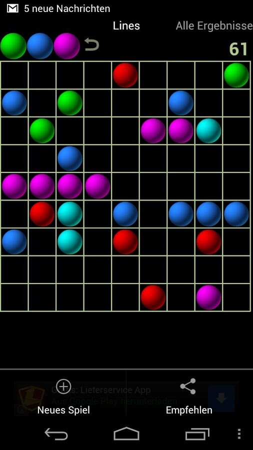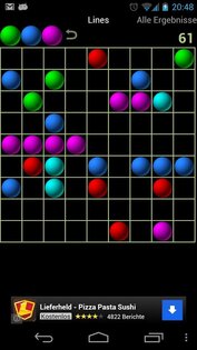Lines Game — реализация известной и популярной в свое время игры Линии (или Шарики) для Android. Ваша задача состоит в выстраивании в линию по 5 штук и более шариков одного цвета. Можно выстраивать линии по горизонтали, вертикали или диагонали. Продержитесь как можно дольше и наберите максимум возможных баллов.