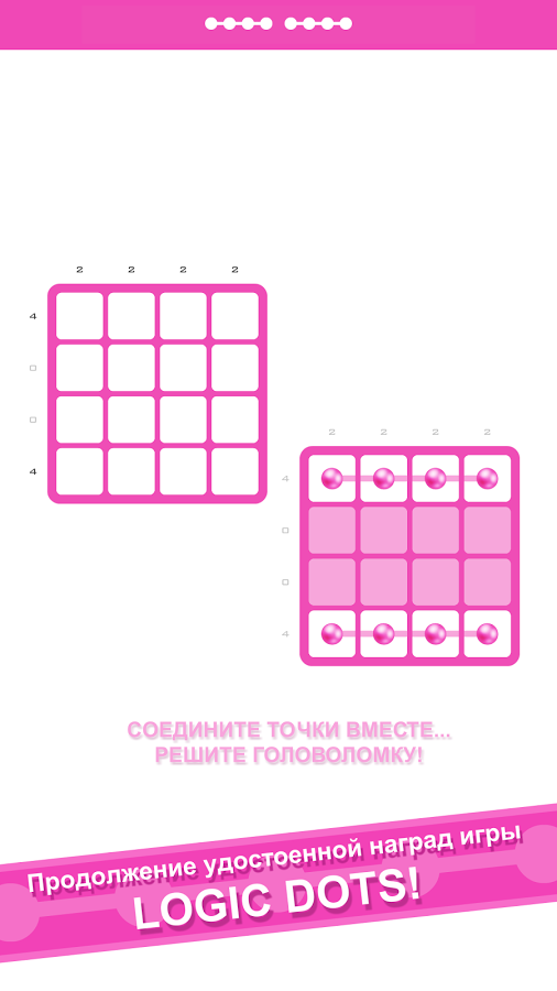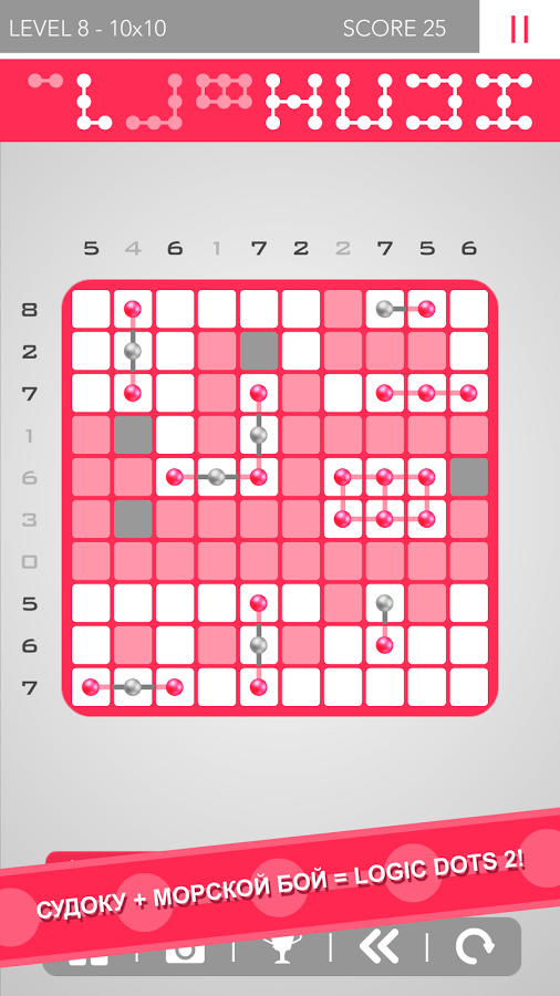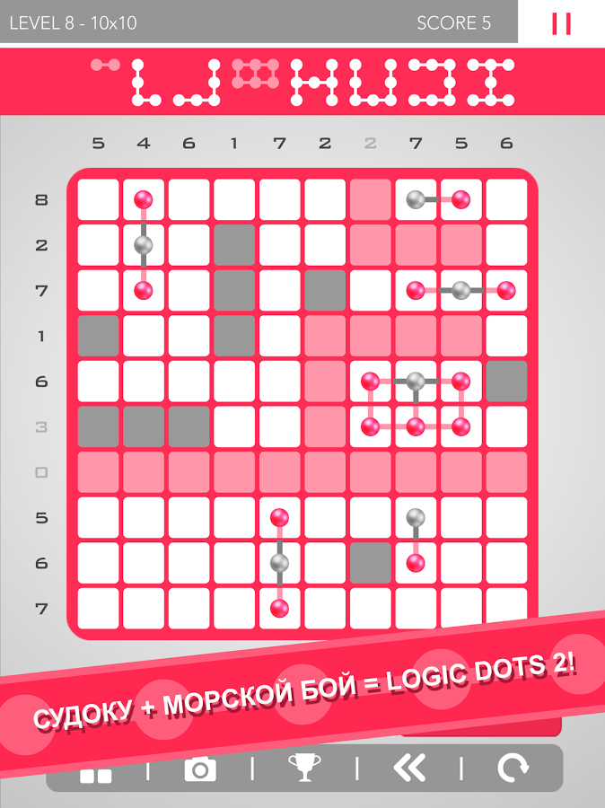 Если вам нравится решать оригинальные головоломки, вам нужна игра Logic Dots 2! Это — очень легкая и увлекательная игра: располагайте точки в ячейках, чтобы составлять фигуры и решать головоломки. Эта уникальная, невероятная комбинация судоку и морского боя отличается простотой и логичностью, но постепенно становится все сложнее. Игра Logic Dots 2 удивит и порадует вас в равной степени.