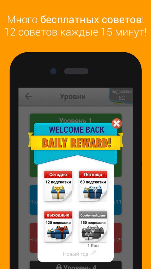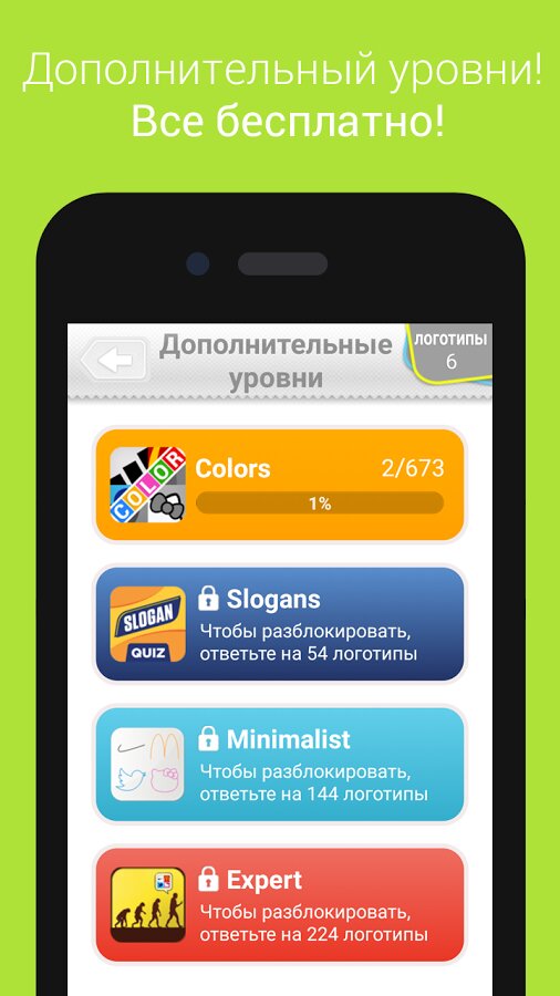 - Полезные подсказки. Каждый логотип имеет 4 подсказки.