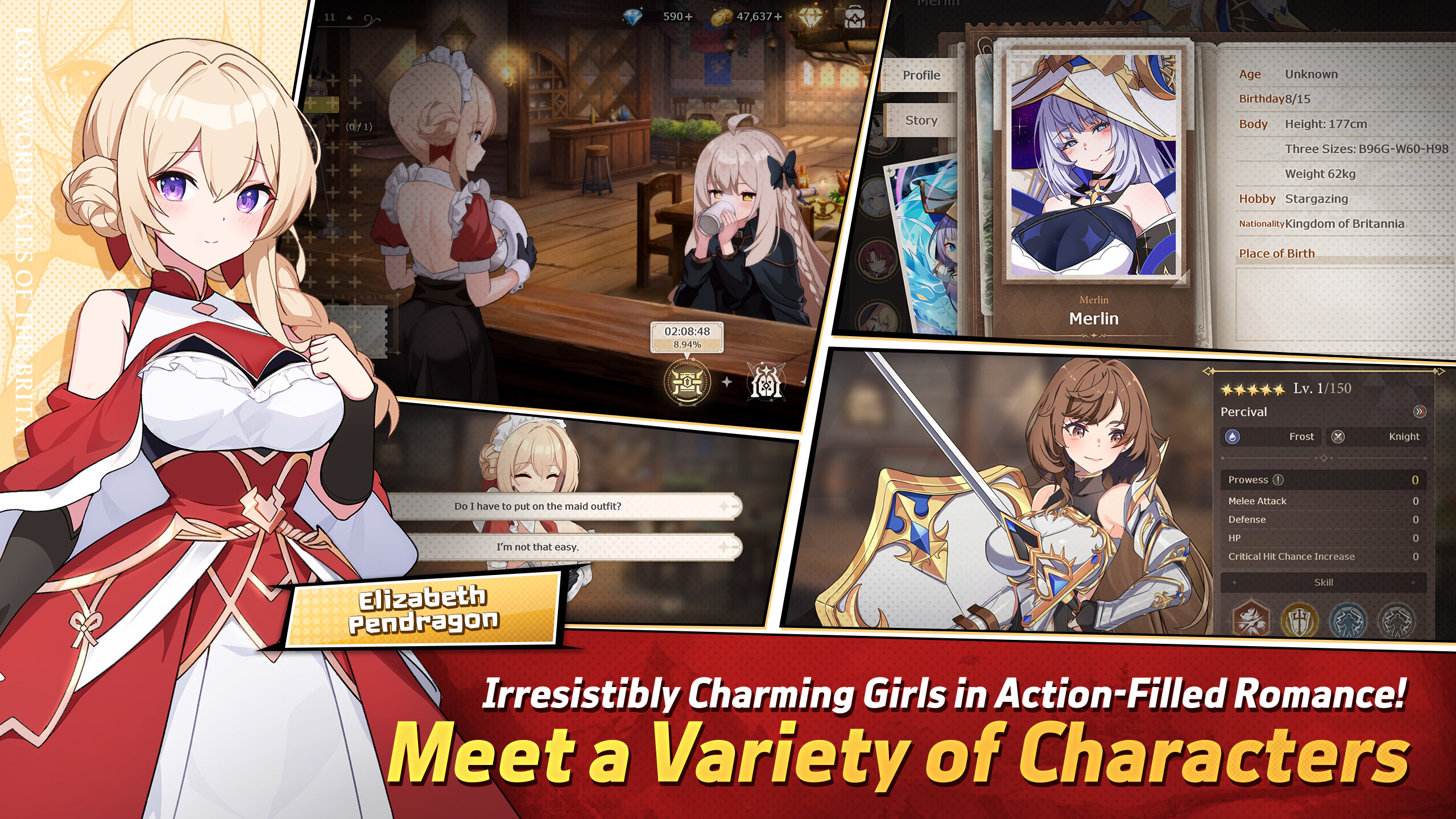 Отправляйтесь в приключение по миру исекай вместе с такими запоминающимися персонажами, как фея-королева Моргана и принцесса Элизабет. Участвуйте в сражениях в реальном времени, где ваша группа автоматически вступает в бой с врагами, а вы в решающие моменты применяете впечатляющие навыки. Увлекательный сюжет следует за вашим поиском легендарного меча Экскалибур в мире, погруженном в хаос после падения короля Утера. Установите связи со своими товарищами через интерактивные диалоги и совместные сражения.