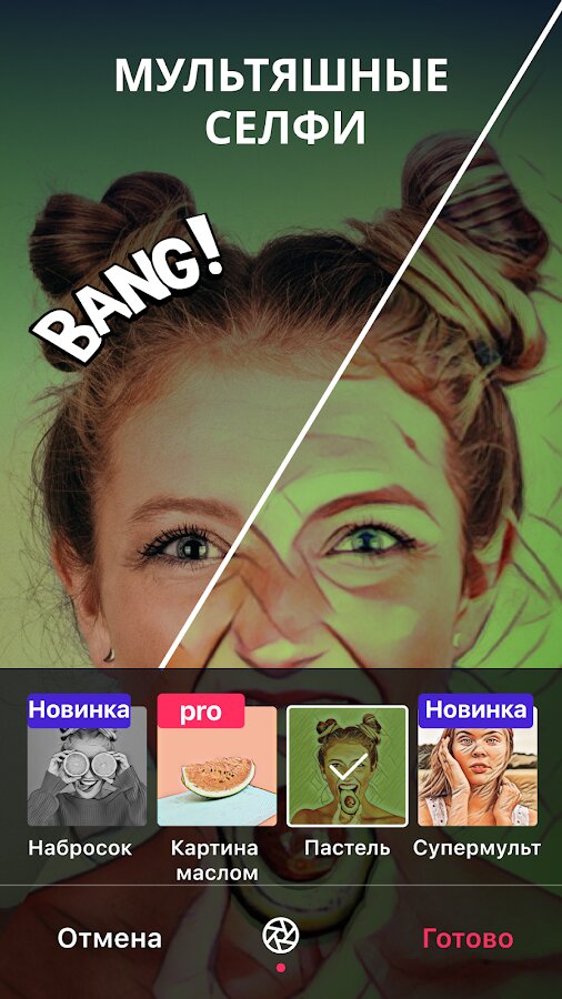- Всего за несколько секунд превратите свои фотографии в комиксы, мультяшных персонажей, скетчи, картины маслом или карандашные рисунки.