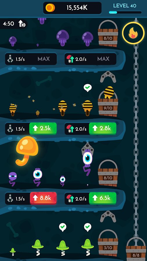 Ваша прибыль будет расти, даже когда вы не будете находиться в игре. Инвестируйте свою прибыль с умом, чтобы ваш бизнес процветал, а клиенты всегда оставались довольными. Создавайте зелья от всех болезней, помогите человечеству улучшить свою жизнь, а взамен, оно улучшит вашу. Используйте всяческие вспомогательные бусты и бонусы, чтобы мгновенно увеличить свой доход в несколько раз. Развивайтесь и творите добро вместе с Magic Mushrooms!