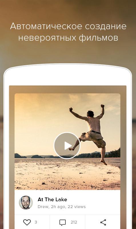 Используя это приложение вы сможете превратить любое ваше видео в короткометражный фильм за считанные минуты. Все приложение основано на искусственном интеллекте, поэтому все редактирование наполовину автоматическое. Вы сможете объединить сразу несколько компонентов в одном видео: видеоряд, фото, текст, эффекты, фильтры и прочее. С помощью специальных алгоритмов приложение определяет недостатки на фото или видео и автоматически их корректирует. Время от времени приложение будет создавать фильм из фотографий в вашей галерее.