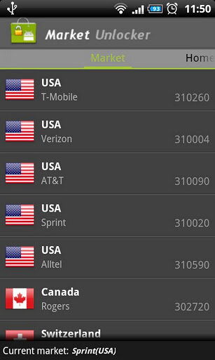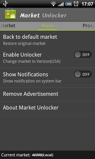Нажмите любой элемент списка в закладке «Market» для включения Market Unocker. Это все. А также вы можете переключиться на Home и Proxy для дополнительных функций.
