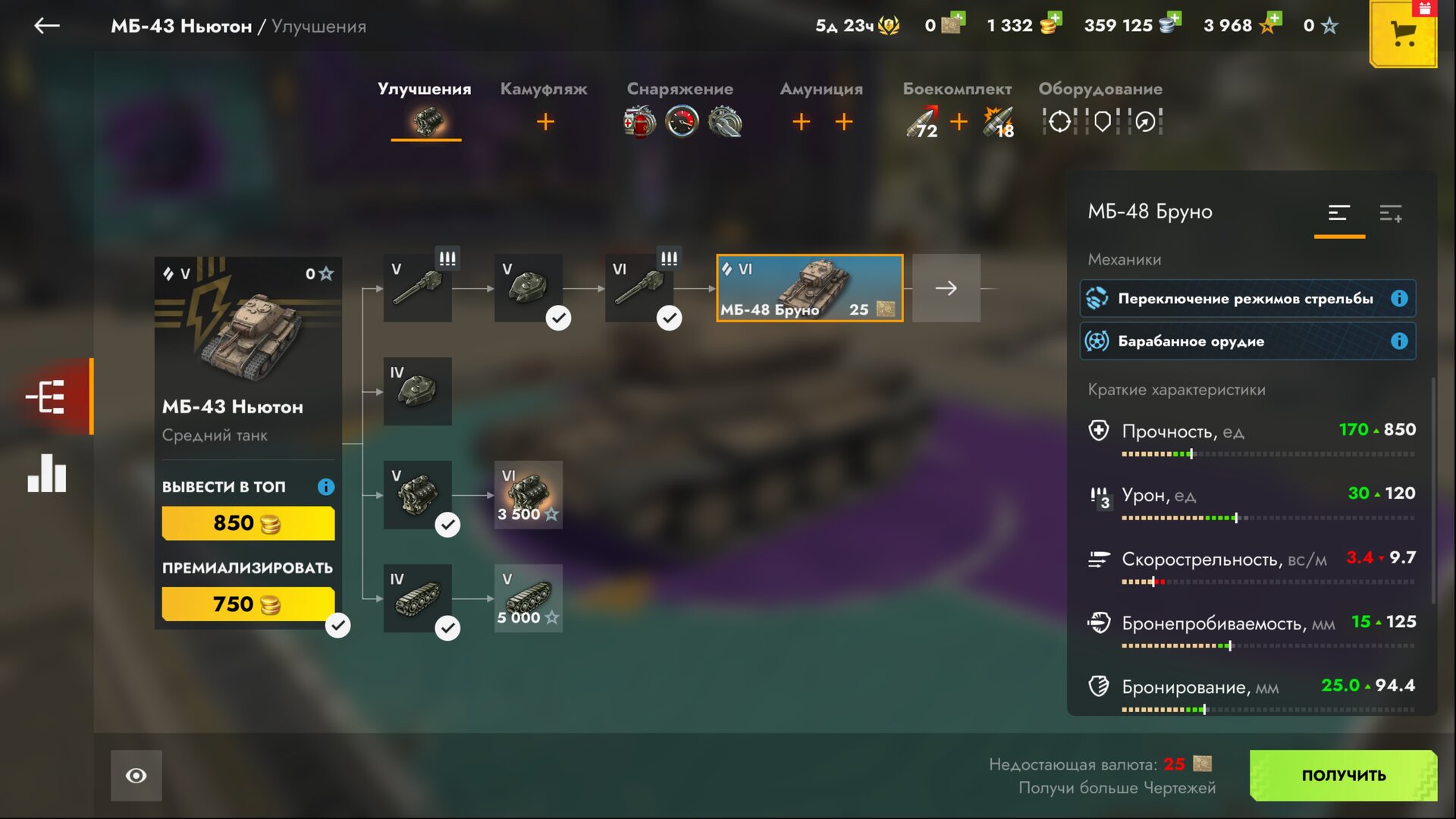 Но для дальнейшего развития по данной ветке нужны Чертежи — на открытие МБ-48 Бруно придётся потратить 25 единиц, на МБ-15 Лавлейс нужно уже 60, а на последнего уровня танк МБ-64 Галилей необходимо потратить 255 штук. При этом на открытие всех танков этой ветки необходимо накопить 595 Чертежей.