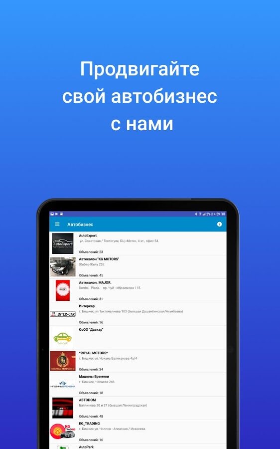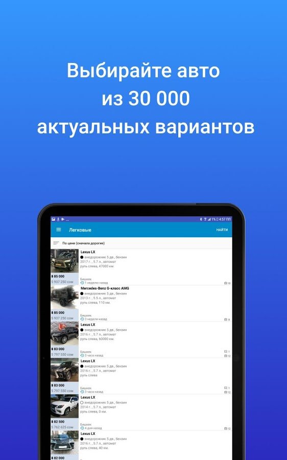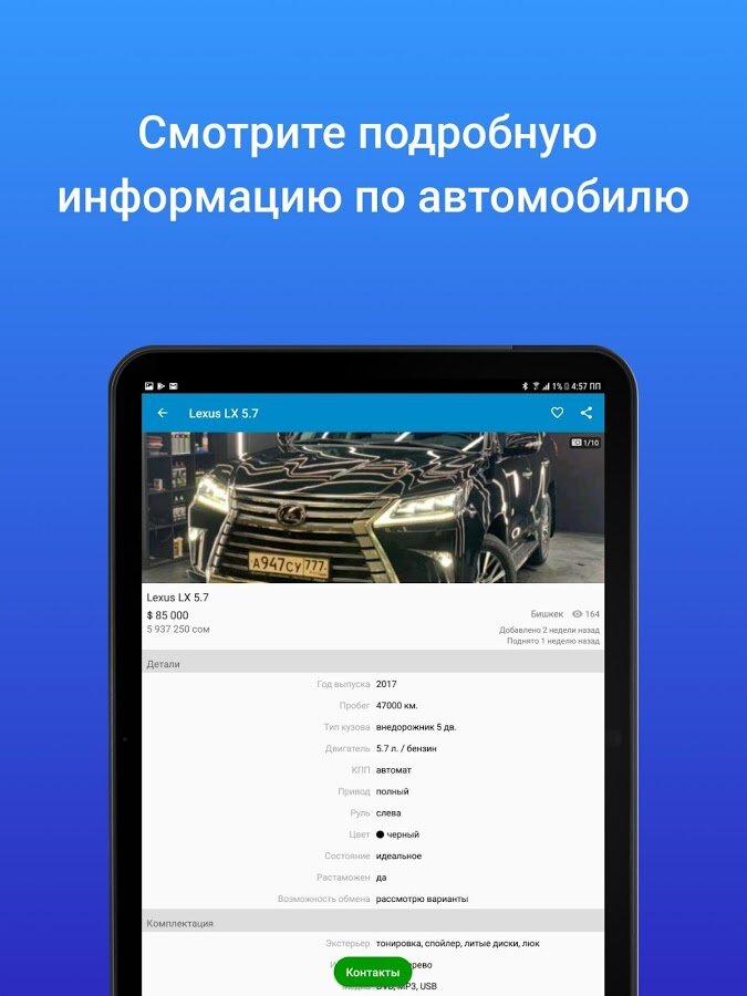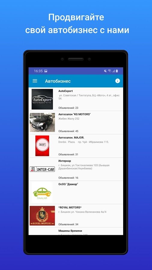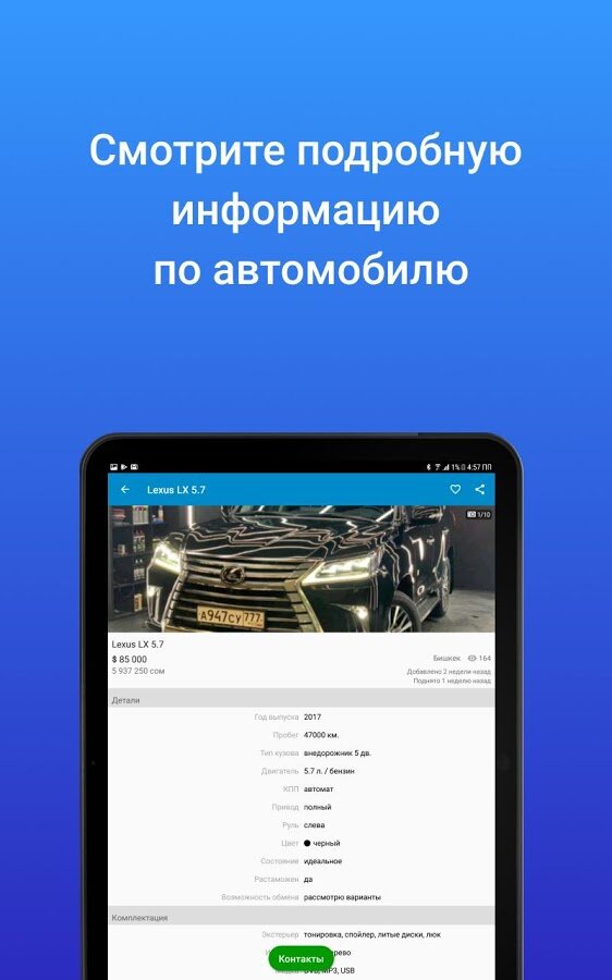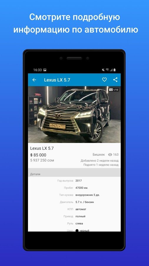 С мобильным приложением Mashina.kg Вы сможете легко найти интересующее Вас авто по любым критериям и в кратчайшие сроки — находясь в машине, дома, на работе, на улице, в кафе или за городом! А простое и понятное добавление новых объявлений придется по душе всем продавцам авто!