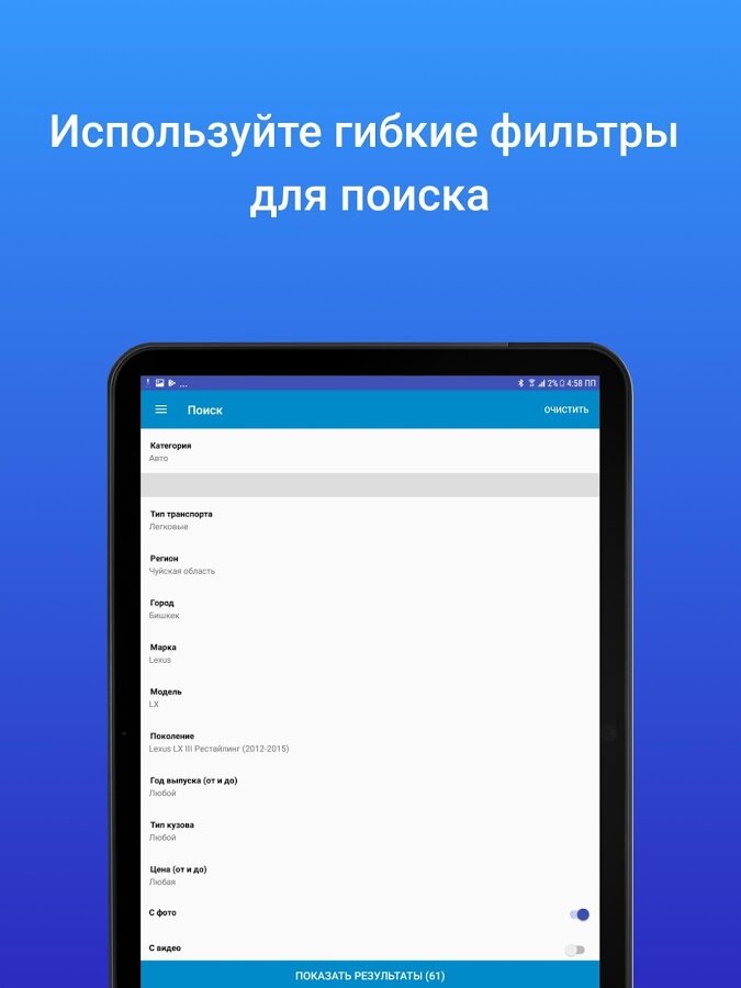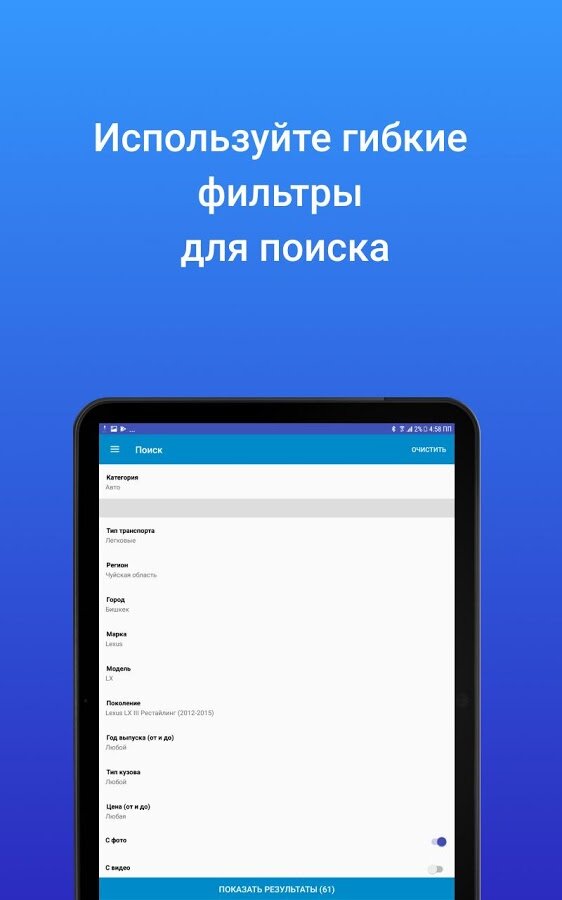 Приложение Mashina.kg имеет интуитивно понятный интерфейс и обладает самыми эффективными фильтрами поиска, не имеющими аналогов на рынке Кыргызстана!