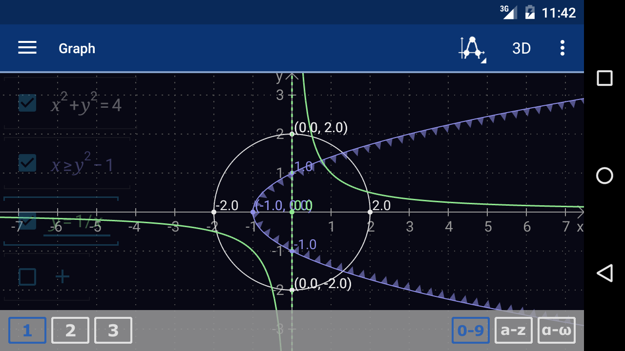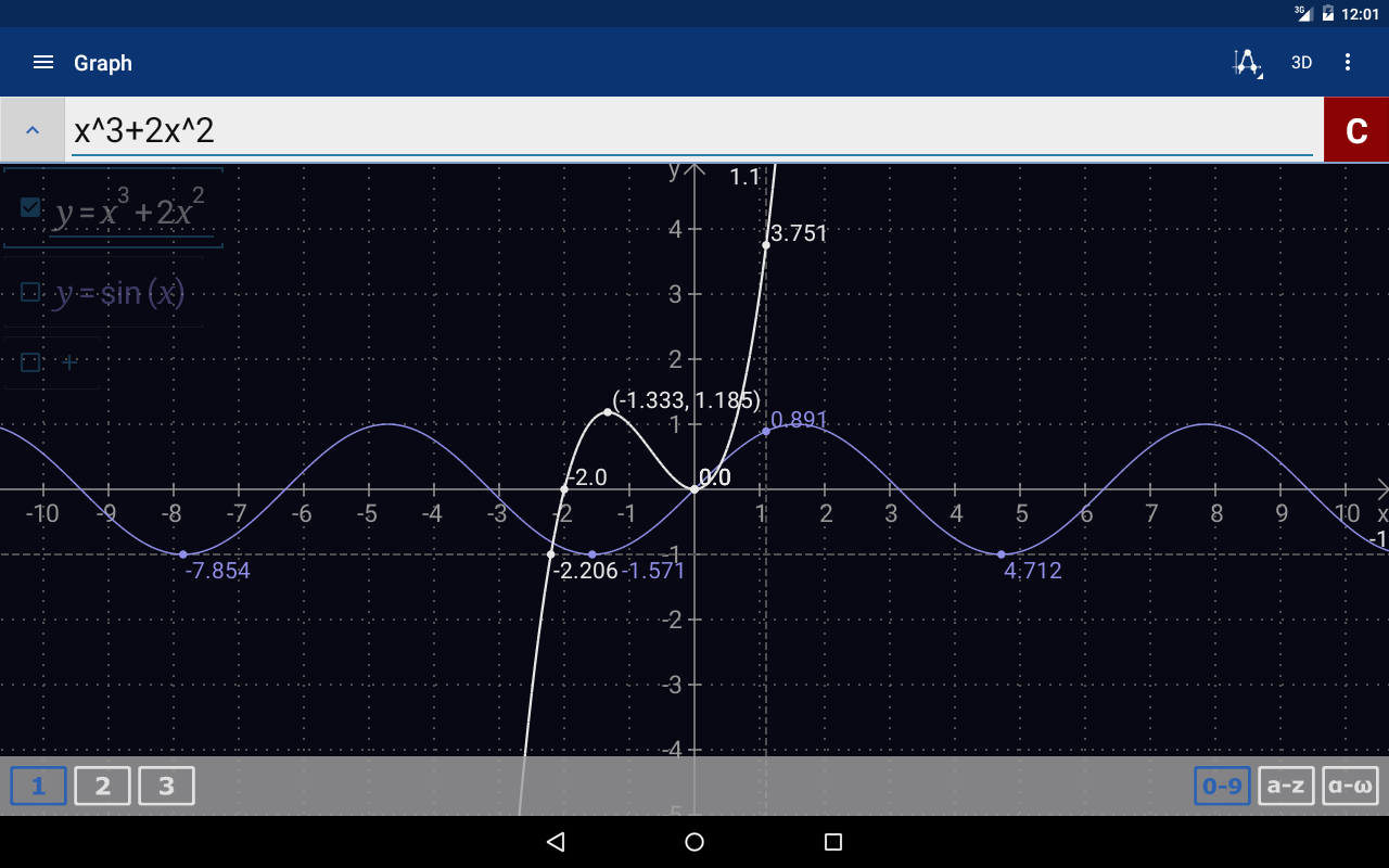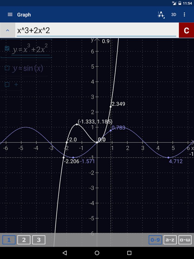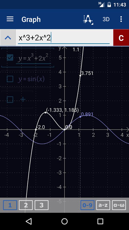 Во-вторых, возможности построения графиков просто потрясающие! Мало того, что калькулятор отлично отображает графики, но также автоматически генерирует х- и у- значения и показывает их. Калькулятор находит координаты точек пересечения, корней функций, экстримов и точек перегиба, и показывает их значения, если указать это в настройках.