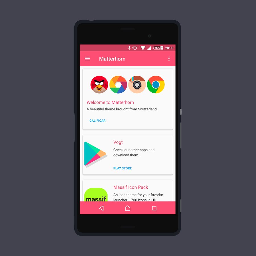 Matterhorn — иконки с «агрессивным» материальным дизайном. Значки значительно упрощены, у многих нет фонов. Особенно симпатична местная иконка Angry Birds. В наборе более 420 иконок и 12 фонов для рабочего стола.