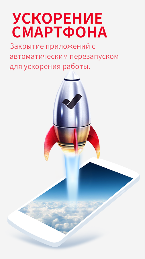- Ускорение смартфона на 50 % за счет освобождения места в памяти и остановки фоновых приложений. Коснитесь ярлыка на главном экране и ожидайте не более 5 секунд.