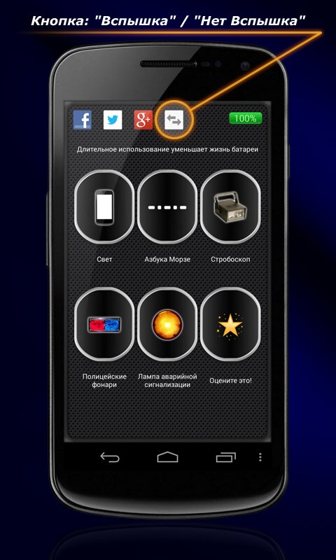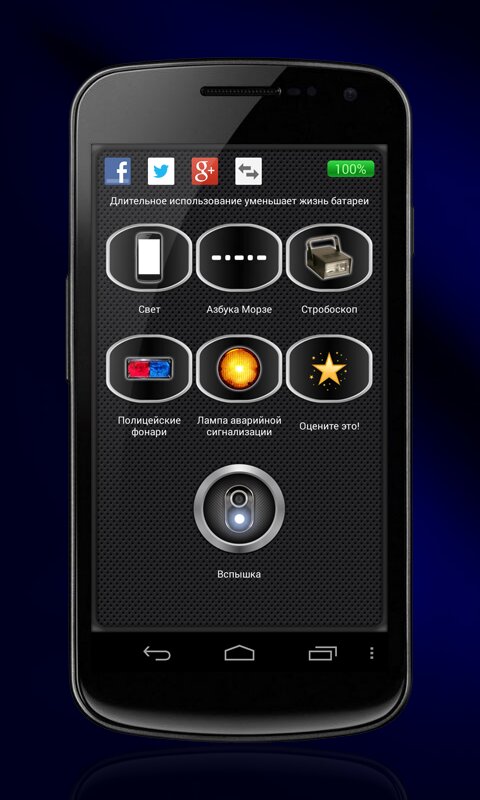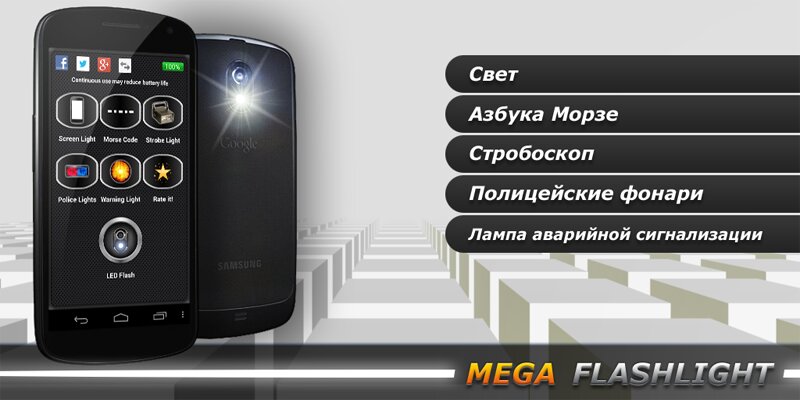 MEGA Flashlight — фонарик для Android. Есть режимы подсветки, передачи сообщений на Азбуке Морзе, режим стробоскопа, полицейского маяка и сигнализации.