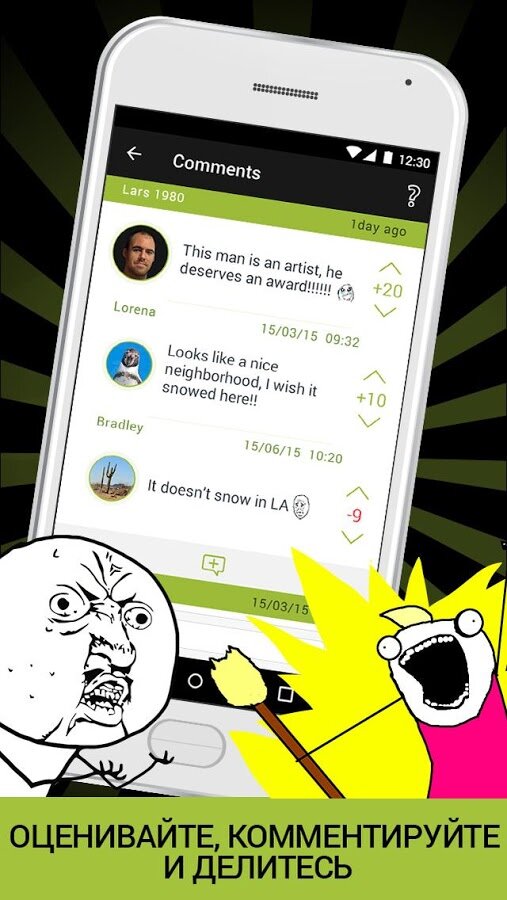 Memedroid — программа для просмотра мемов. Самый веселый способ насладиться яростными комиксами на Вашем Android-устройстве. Memedroid представляет собой читалку яростных комиксов, которая позволяет Вам смотреть, играть, комментировать и оценивать забавным способом или же через социальные сети яростные комиксы (FFFFFFFUUUUUUUUUUUU, Rage Guy, Forever alone, Everything went better than expected, Poker Face, Challenge accepted, Trollface, Fuck yeah…).