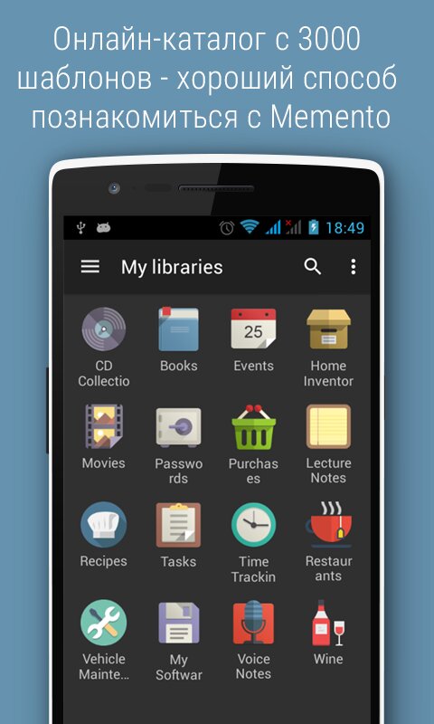 Memento — это личная база данных, которая позволяет Вам хранить все персональные данные в одном месте. Memento состоит из библиотек, каждая из которых содержит записи своего типа.