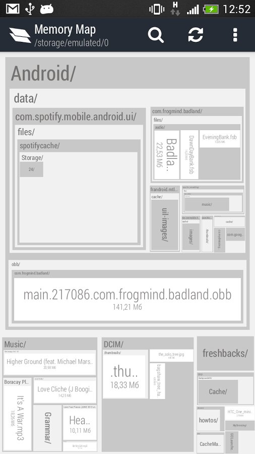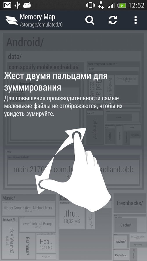 Основная особенность Memory Map — это подход к интерфейсу, в котором вся память вашего мобильного устройства представляется в виде карты, где папки отображаются в виде блоков, а их размер зависит от «веса» в килобайтах, мегабайтах или даже гигобайтах. В каждую папку можно перейти и в каждой из них построится новый каталог с другими папками. Интерфейс очень наглядный — пользователь сразу же понимает, где больше всего хлама, ненужных файлов или кэша. Кроме того, приложение Memory Map способствует пониманию файловой структуры Android. Кроме простого просмотра, в программе присутствует функционал стандартного файлового менеджера, который способен не только удалять пользовательские данные вроде музыки или видео, но и кэш других приложений.